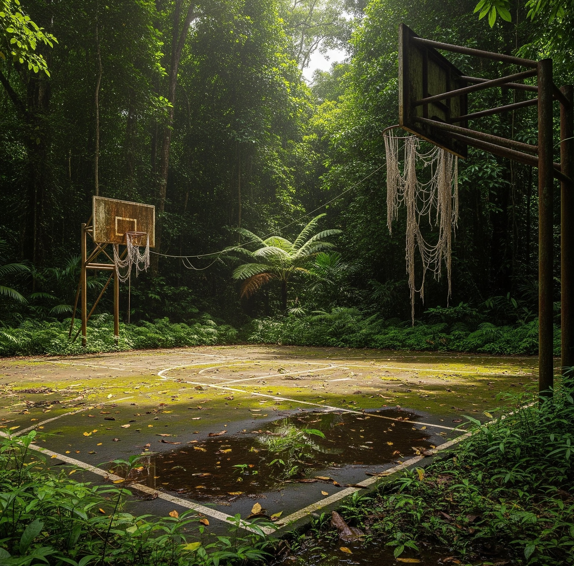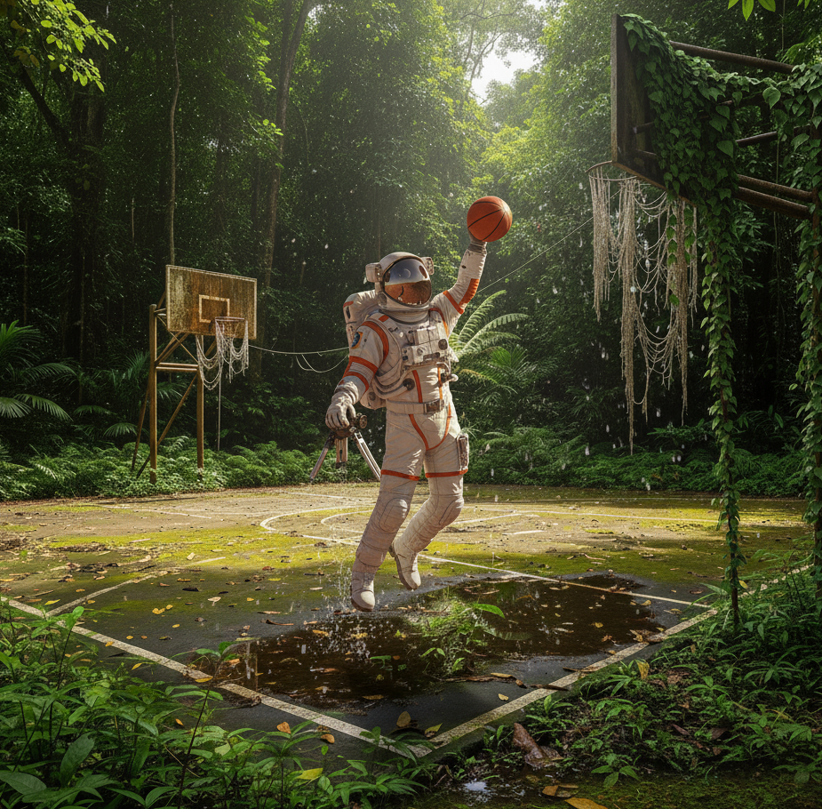 Transform this into a photorealistic picture of an astronaut in a helmet and full suit dunking a basketball in an overgrown basketball court in the rainforest.