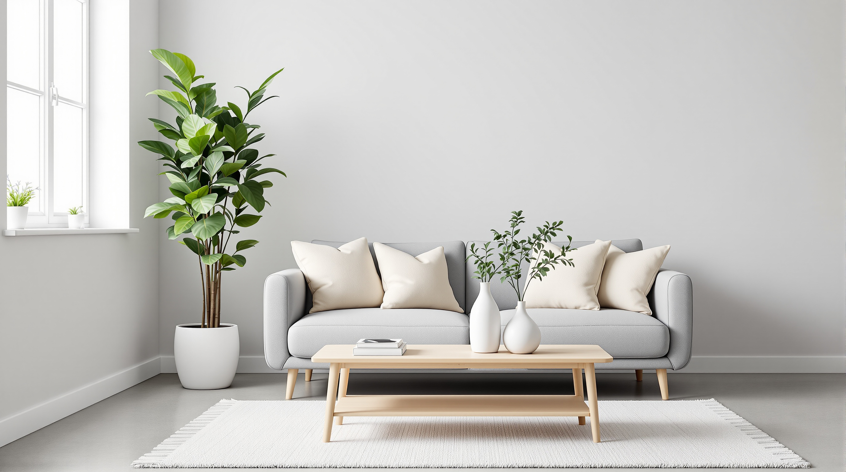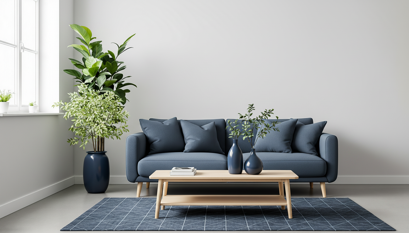 Make this image a minimalist living room with white walls, a large bright window, a dark blue sofa with dark blue throw pillows, a tall dark blue vase with light green leaves, and a dark blue patterned rug on a concrete floor. The style is clean, modern, and simple.