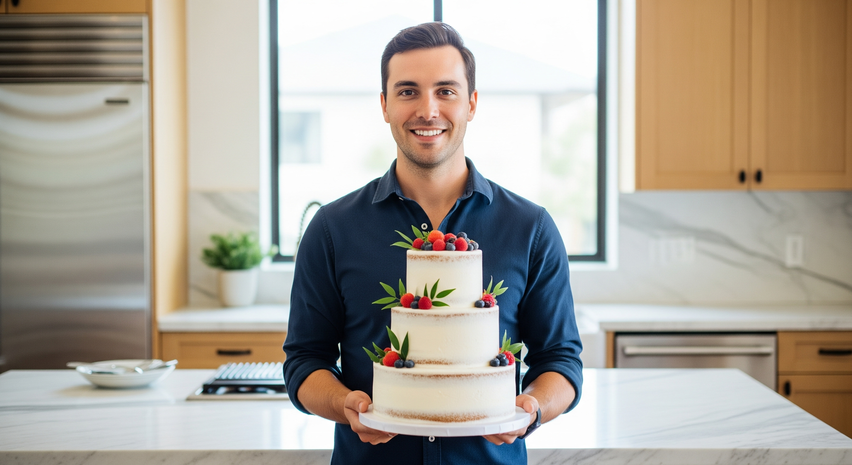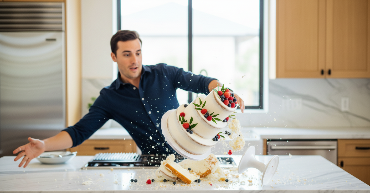 Transform this into a person falling and dropping a 3 tiered cake.