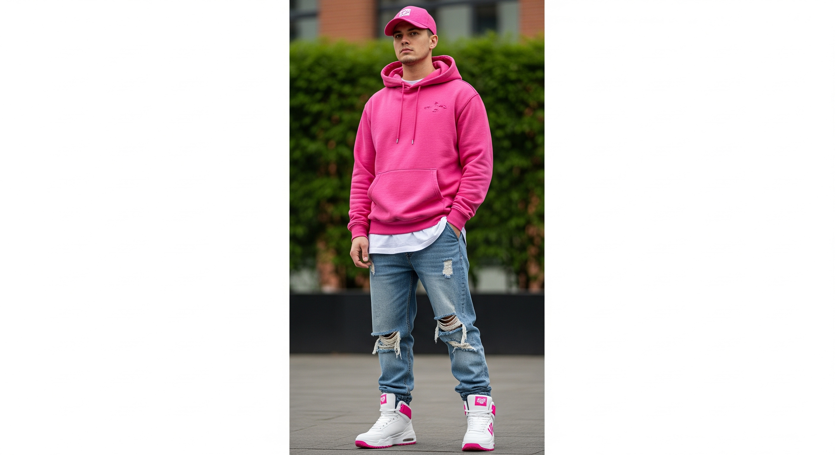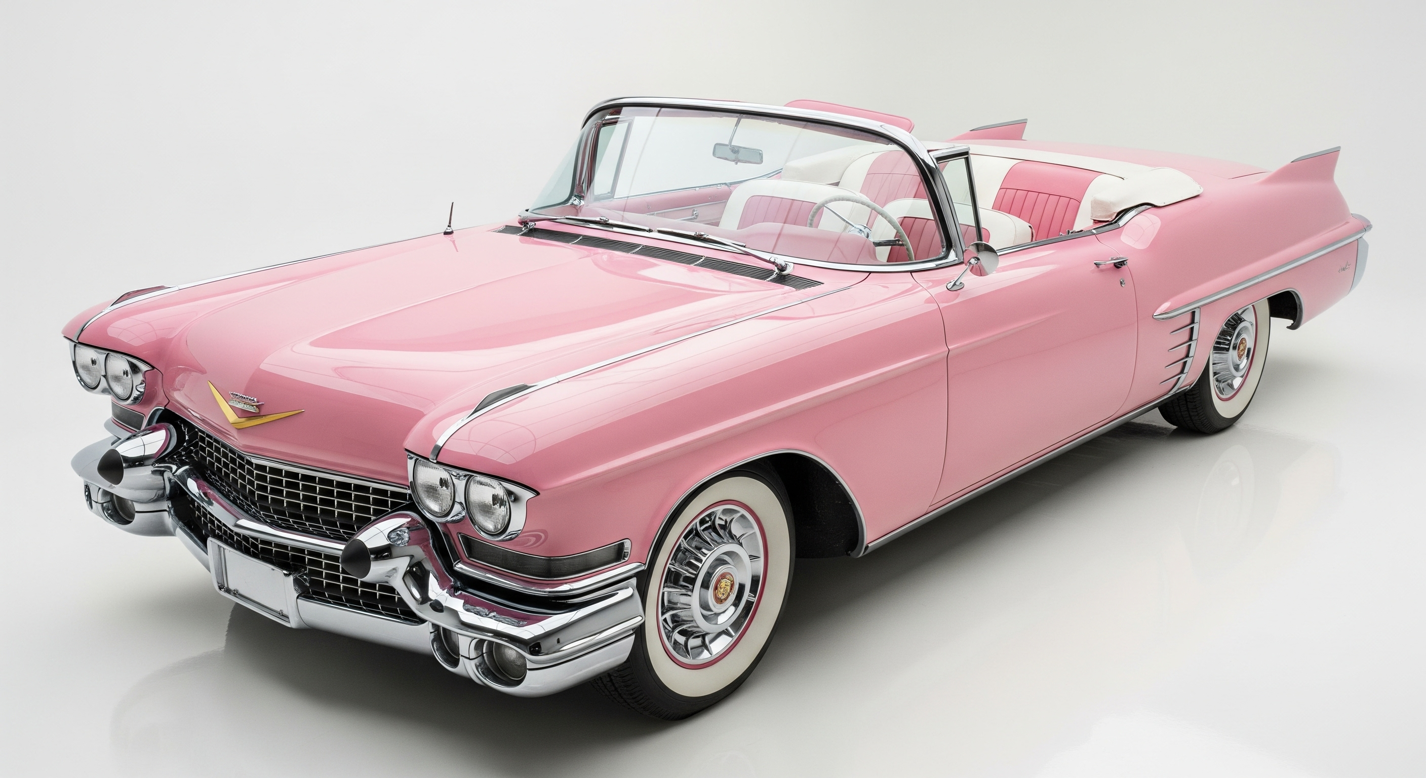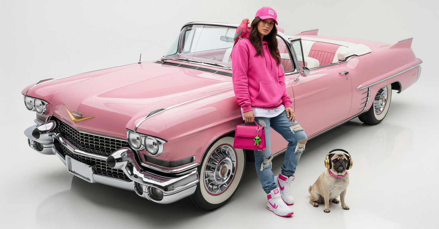 A model is posing and leaning against a pink bmw. She is wearing the following items, the scene is against a light grey background. The green alien is a keychain and it's attached to the pink handbag. The model also has a pink parrot on her shoulder. There is a pug sitting next to her wearing a pink collar and gold headphones.