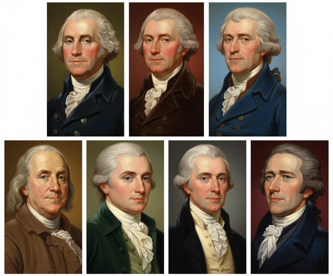 A colorful version of the provided image, featuring portraits of historical figures rendered with vibrant and natural colors, enhancing their features and clothing.