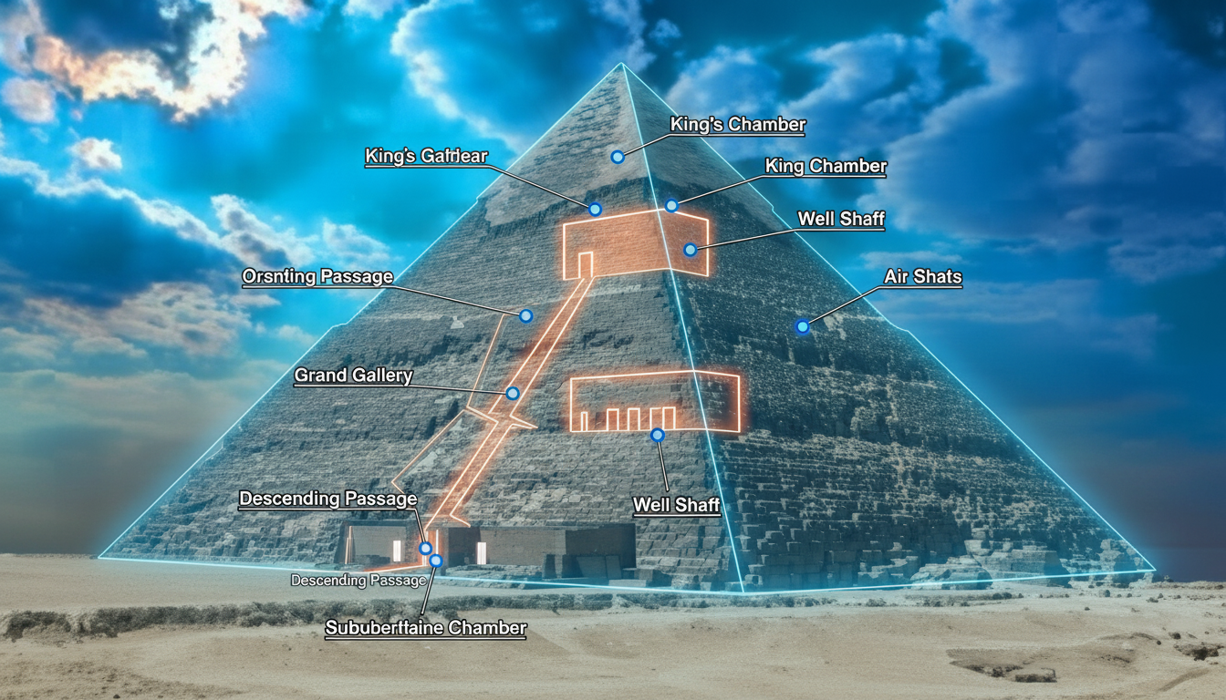 Generate an X-ray view of the image to reveal the interior of the building. Use an AR experience generator to visualize hidden structures. Highlight each point and attach a concise label. Ensure labels are informative and easy to understand