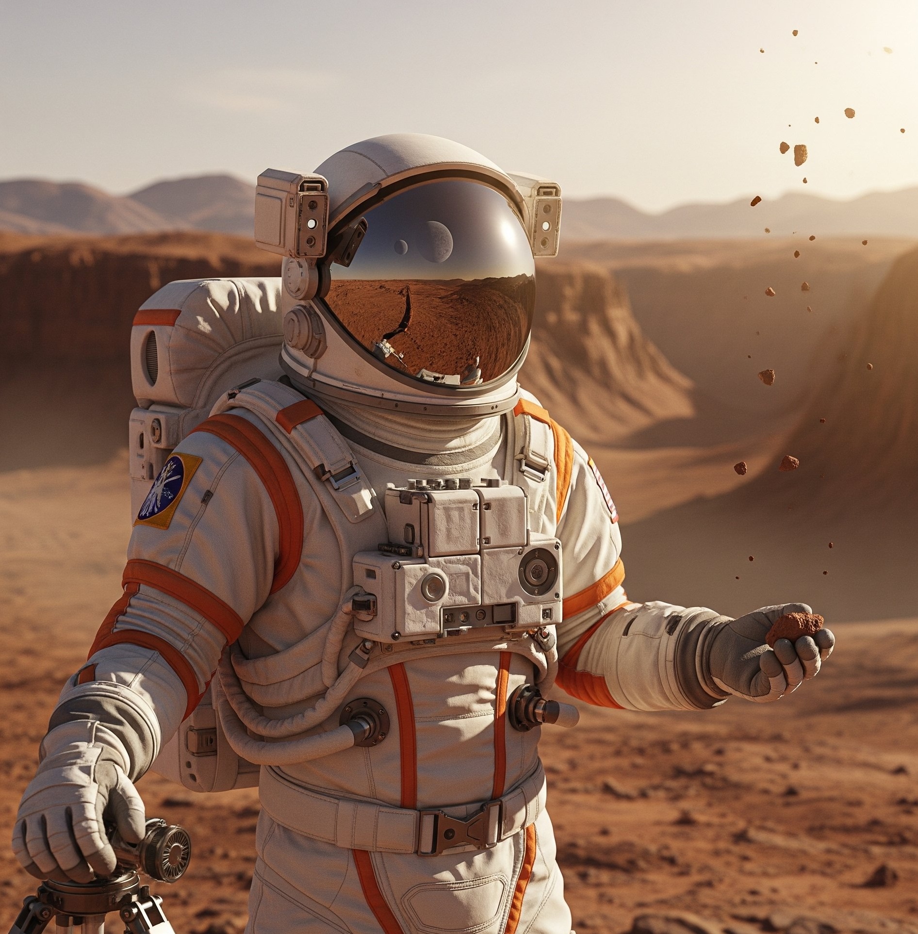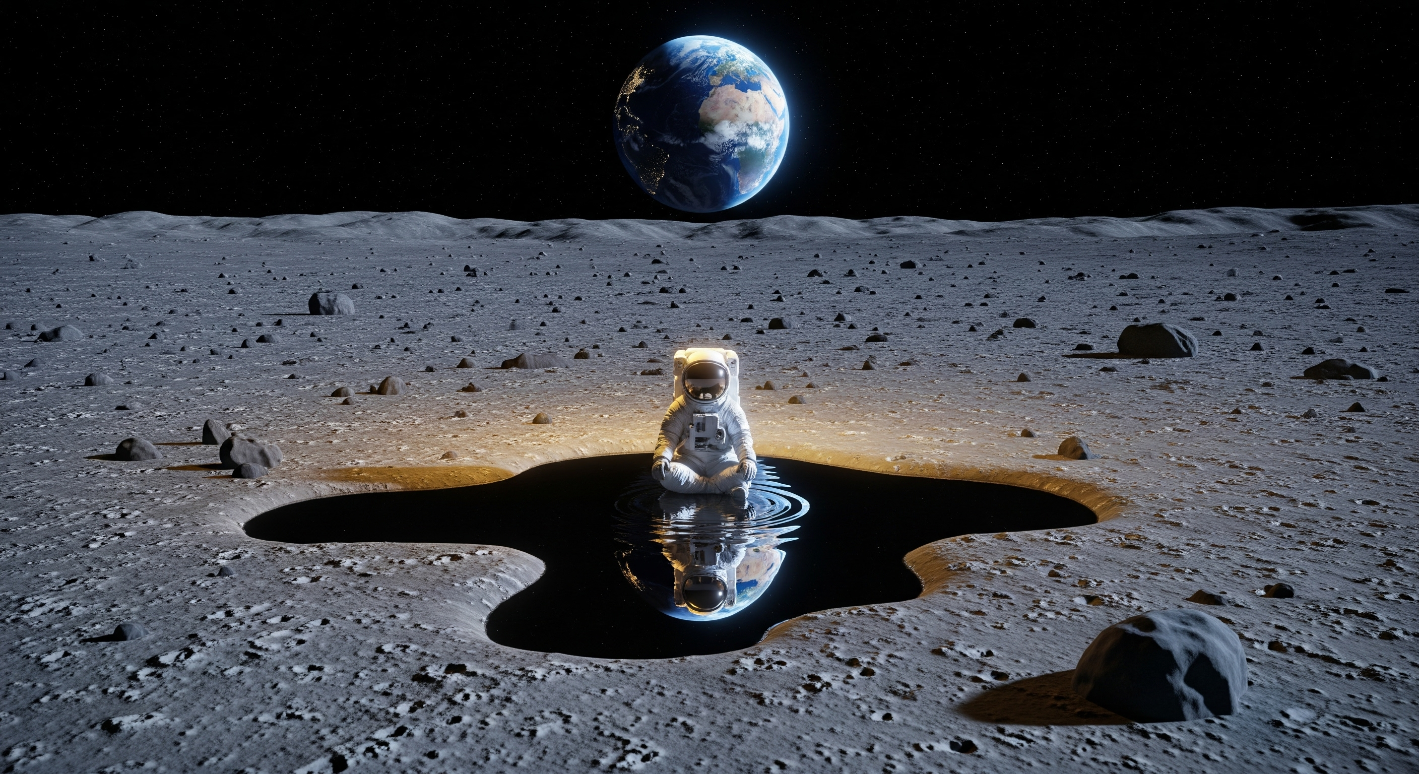A surreal scene on the Moon. A small astronaut in a shiny white space suit sits relaxed inside a tiny pool of water, as if it's a playful bathtub, but not an actual bathtub. The surface of the Moon is gray and dusty, with a realistic Earth glowing in the black sky above. Cinematic, whimsical, surreal mood. Playful but epic lighting, highly detailed, ultra-realistic textures, 8k, dramatic composition.