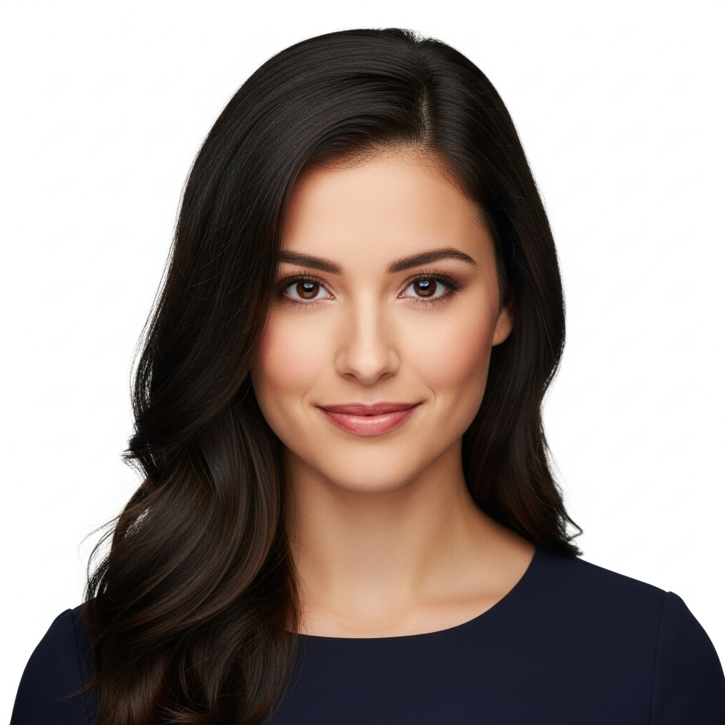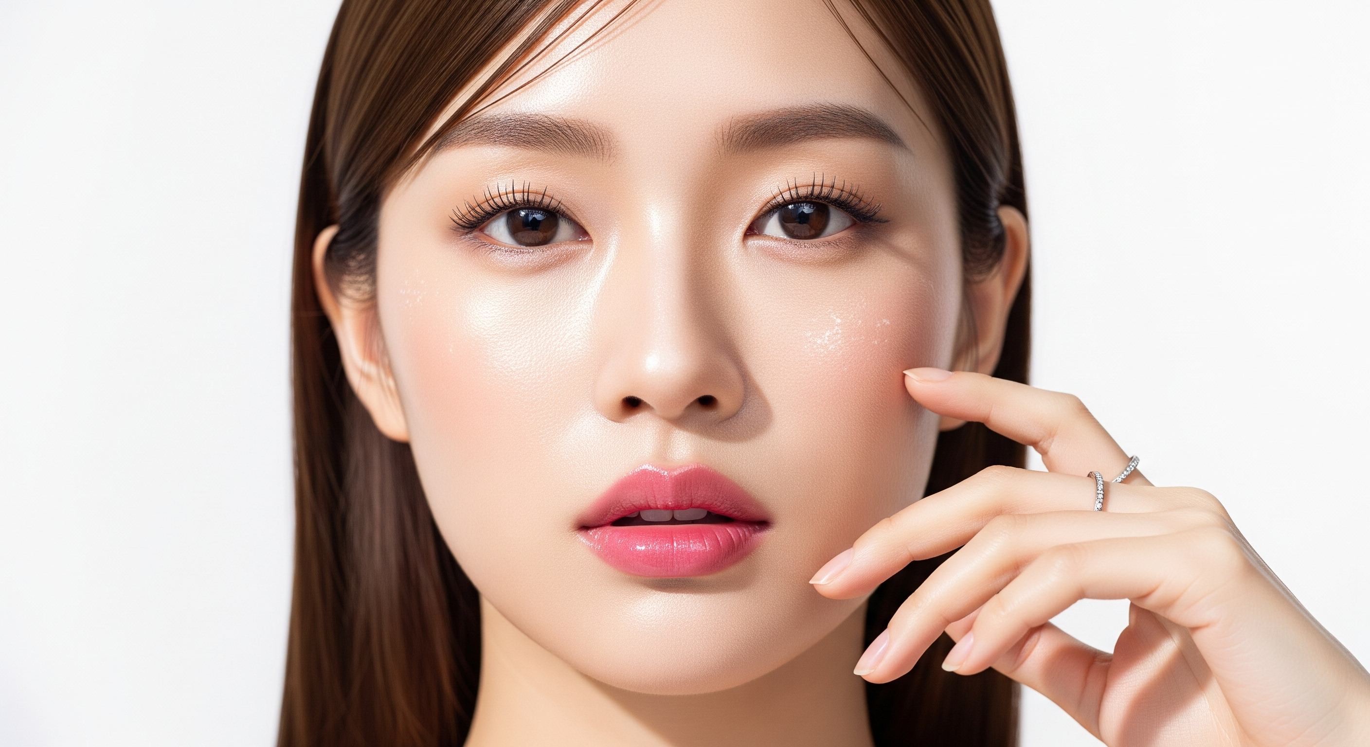 A close-up portrait of a young East Asian woman with porcelain skin and soft pink glossy lips, natural brown straight hair neatly parted with a few strands over the forehead, wearing a minimal makeup look with luminous highlights and subtle lashes, gently touching her cheek with slender fingers adorned with a thin silver ring, expression serene and elegant, studio setting with a clean white background and soft diffused lighting, captured in a high-resolution beauty editorial style with a clean and dewy aesthetic.