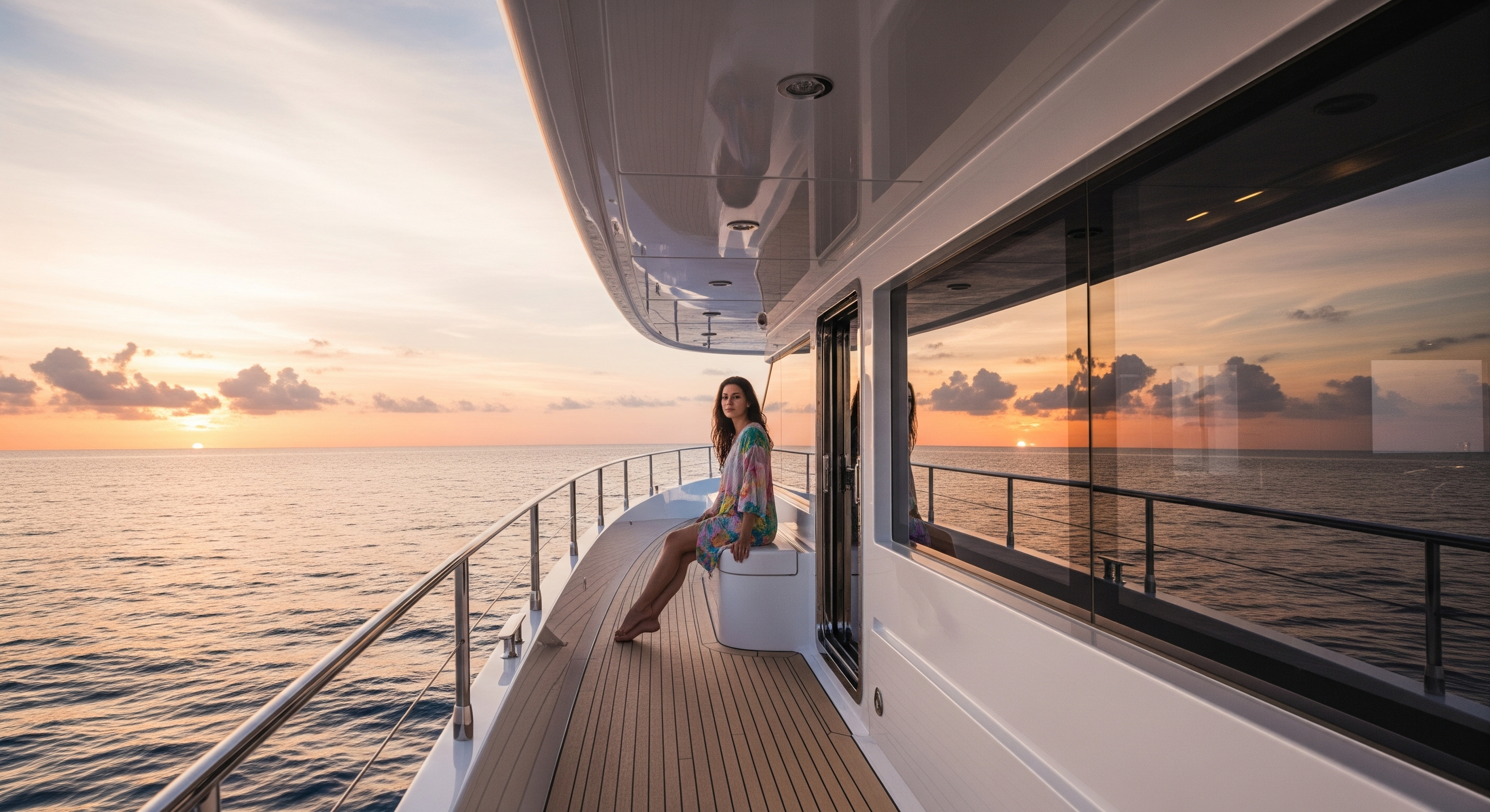 A brunette woman with freckles; I want her to be very realistic, set in an ambiance of pastel tones and a dreamy atmosphere. She should be on an ultra‑luxurious wooden yacht with large windows.