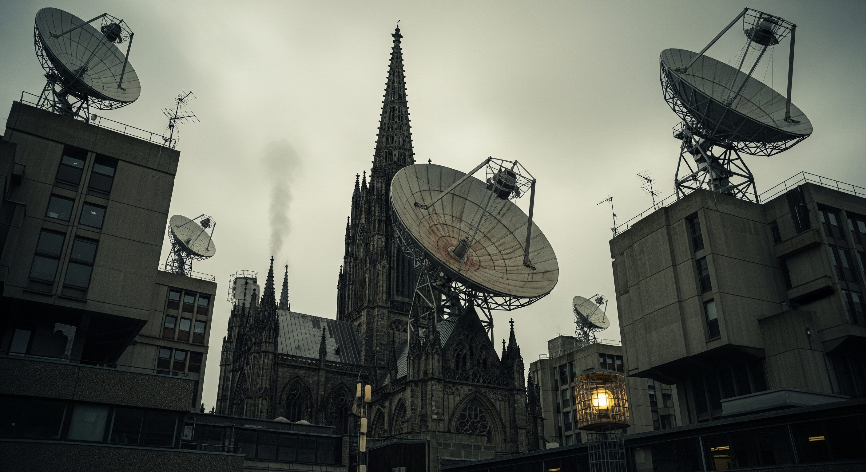 film photo of a giant historical city,megalopolis,brutalism architecture,gothic,church,giant parabolic antennas,mystic vibe, grunge tones, realistic, photorealistic,kodak VISION3 500T , filmic, cinematic, 2.35, film still, shot, beautiful, cinematic lighting, taken by a disposable camera, psychological horror movie, Directed by Ari Aster,