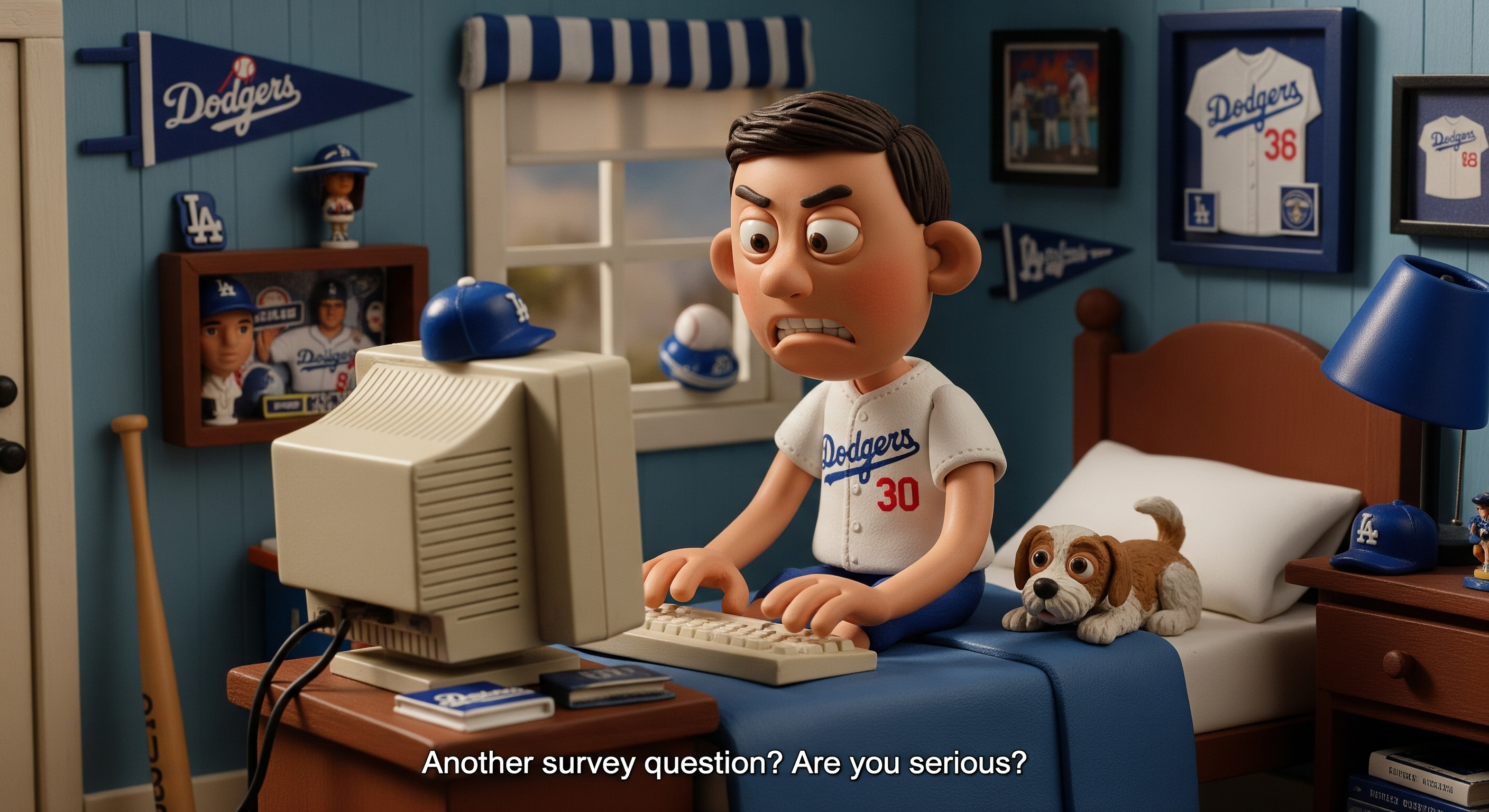 a young boy made out of clay, very high end imagry for movies, our main charater is at home sitting on his bed, the room is vibrantly decorated in dogers baseball fandome a cute dog is curled up at his feet. He is taking an online survey on his desktop and cursing.