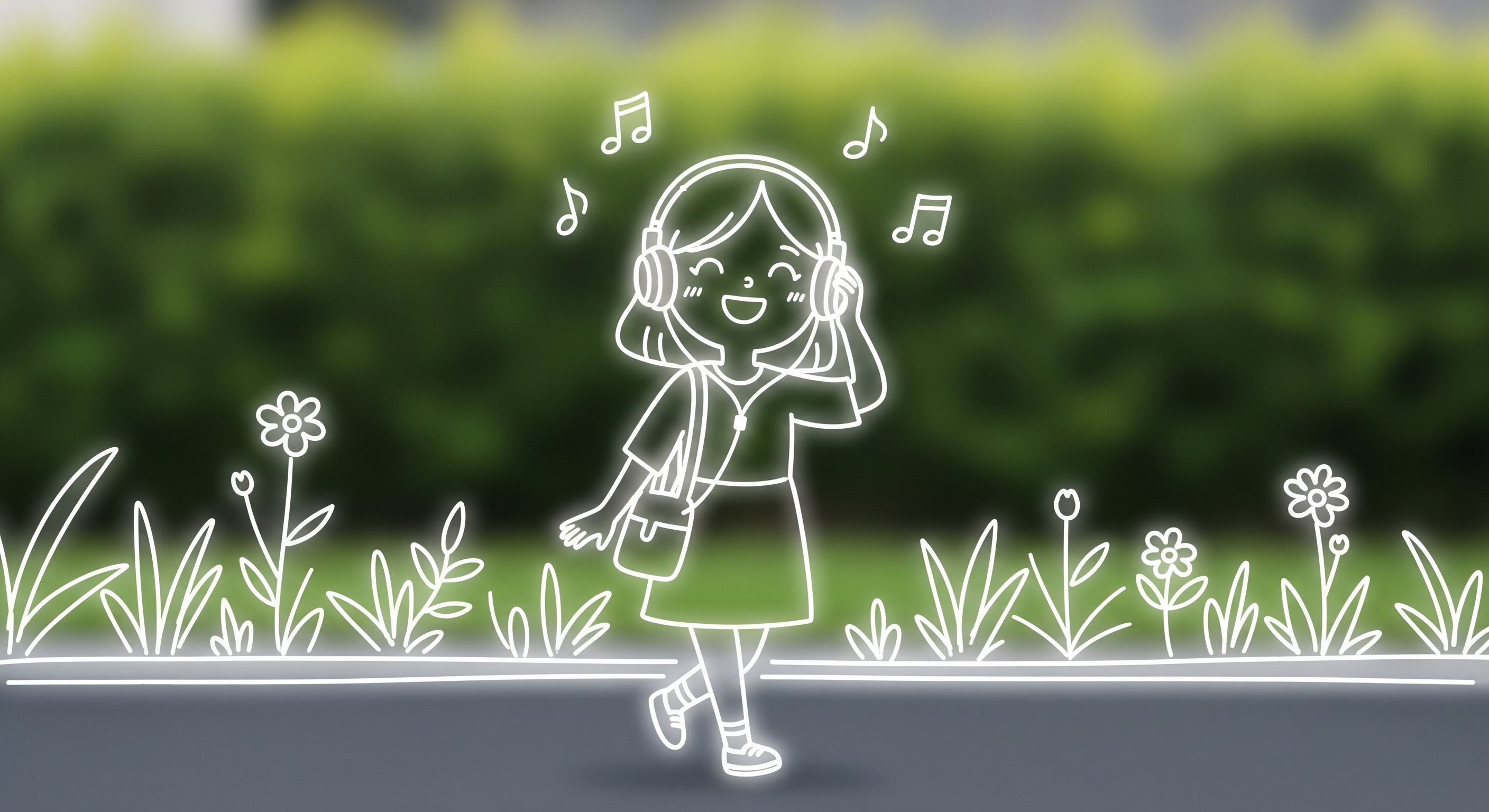 A cute woman is walking on the road, listening to music with headphones and smiling happily. The background features blurred green plants and flowers. Children's simple drawings, minimalist lines, white lines, thick lines, brighter glowing outlines on the character. Musical notes are floating around her head, adding an artistic touch to the entire scene. Her whole body is depicted using a minimalist style, giving people warm feelings.