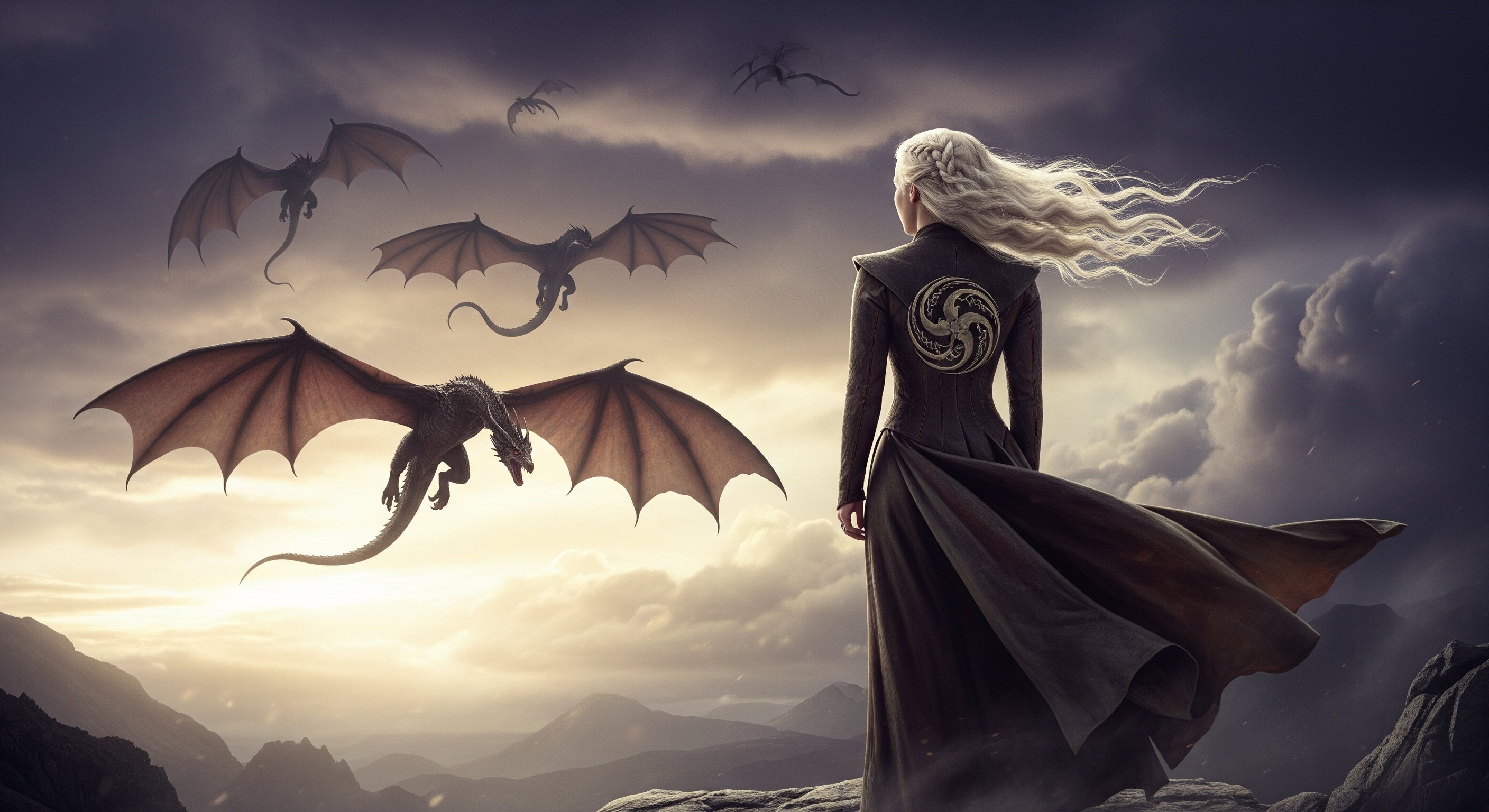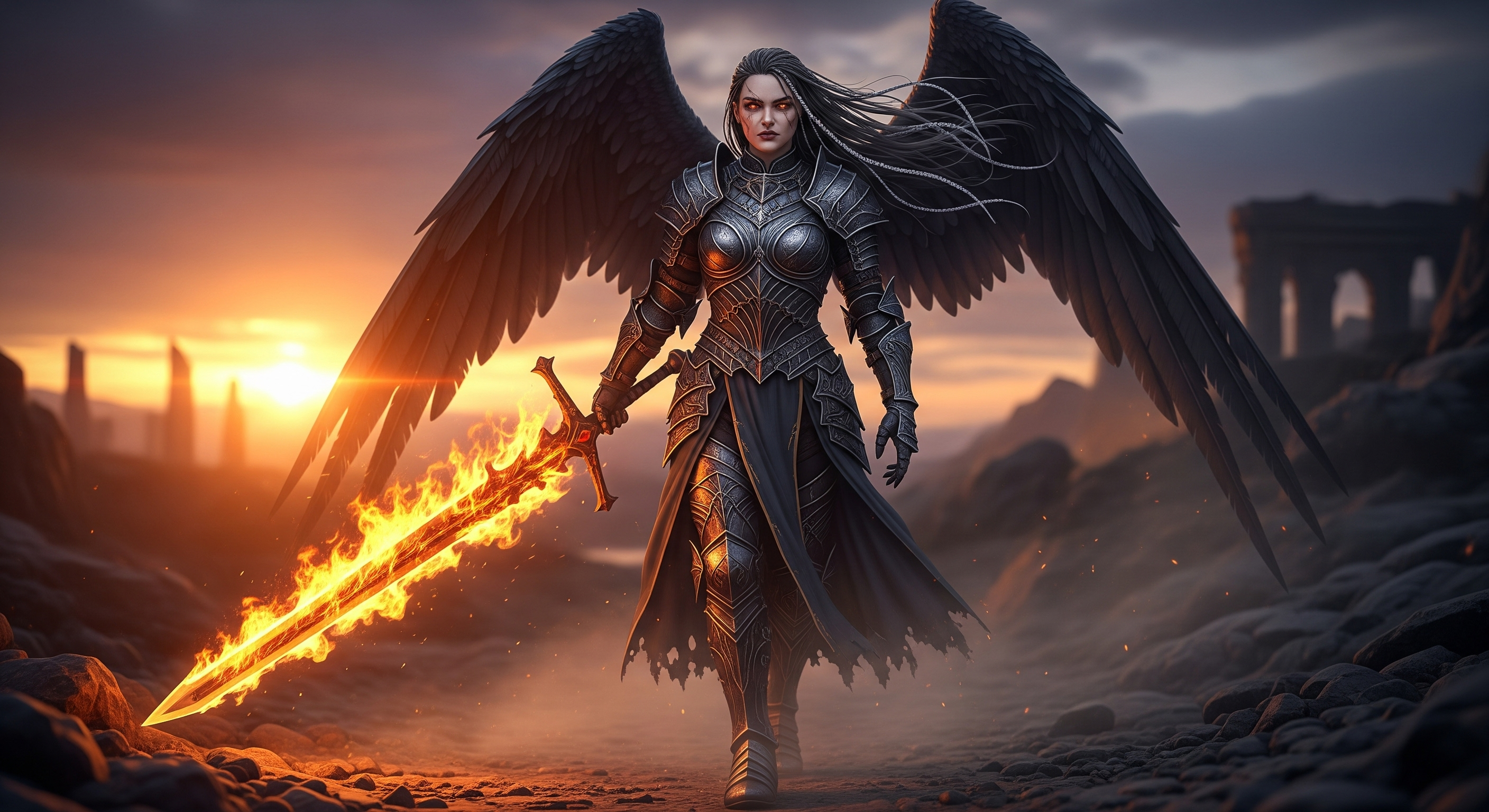 a female dark knight walks towards the camera; her blade flaming; her hair blows slightly in the breeze; she gently raises her wings