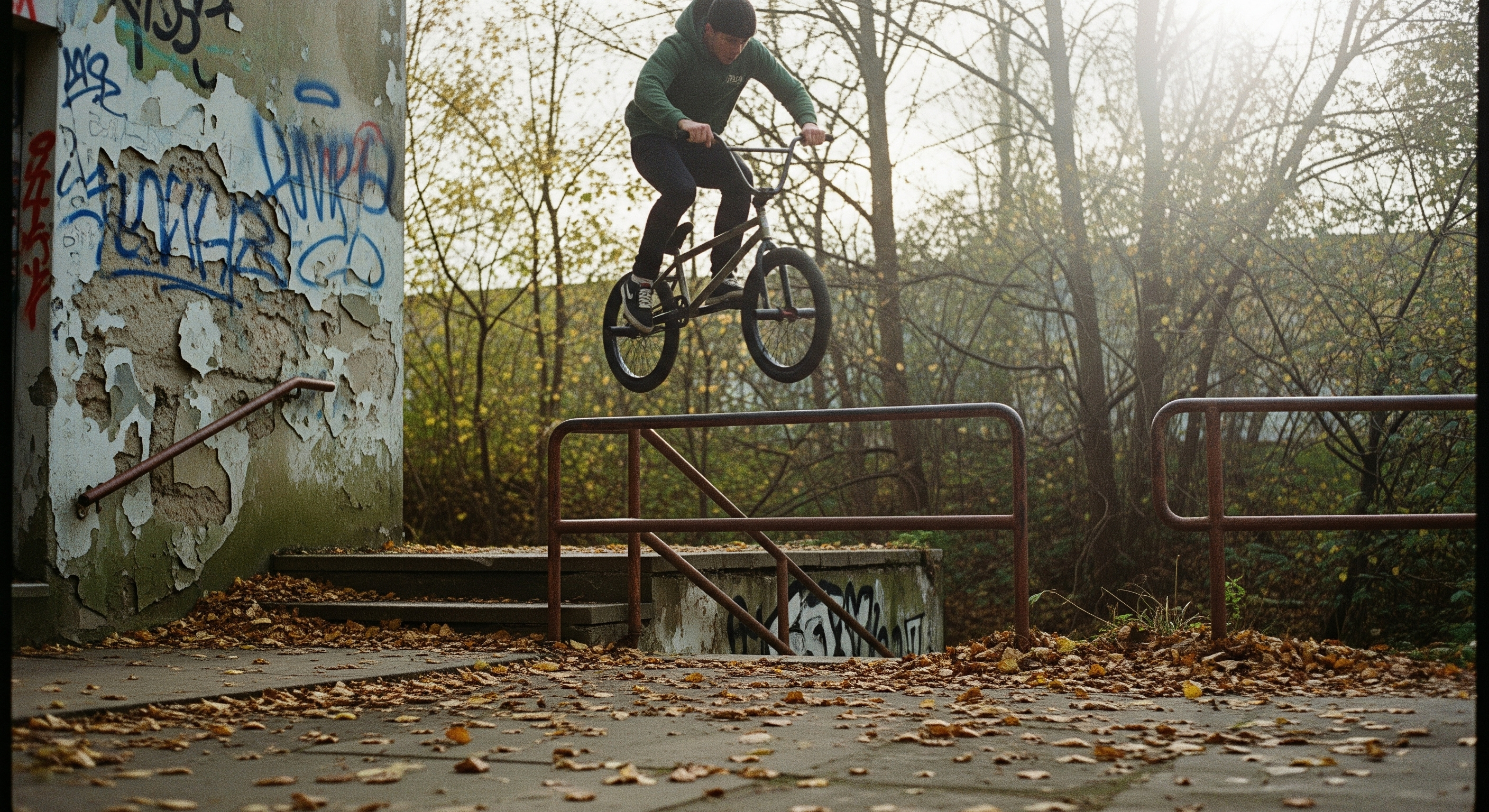 Render a raw, analog-style street photo of a BMX rider caught mid-air above a staircase handrail. The environment shows signs of urban decay chipped walls, rust-streaked railings, and scattered leaves. The light is diffused through trees, with analog imperfections like grain, halation, and soft bloom enhancing the nostalgic feel. The composition feels spontaneous, as if shot on 35mm film. Use a Gritty Analog Film Style with tactile realism.