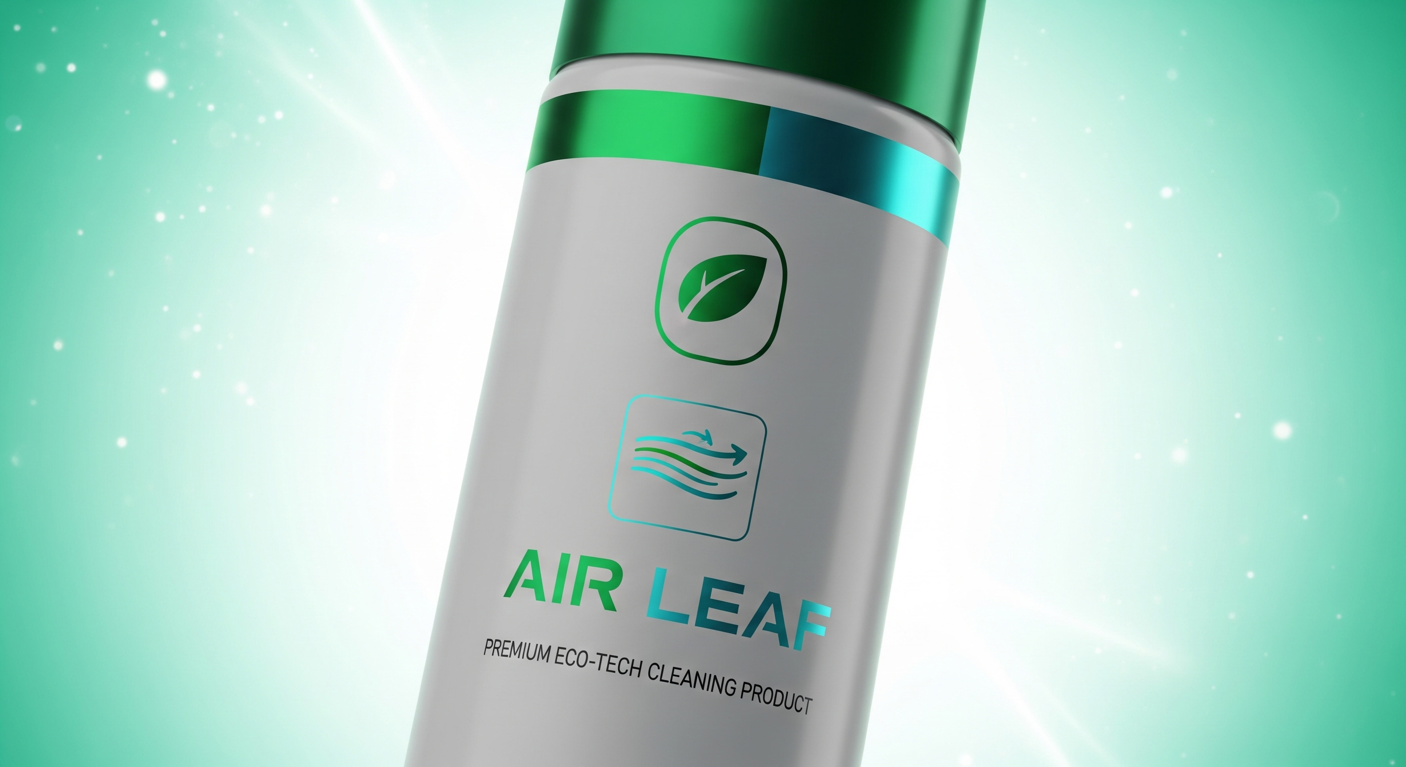 Air Leaf aerosol spray can, matte light gray with emerald and aqua blue accents, minimal leaf + airflow icon, futuristic bold typography 'Air Leaf', premium eco-tech cleaning product design, photorealistic studio render, bright fresh background