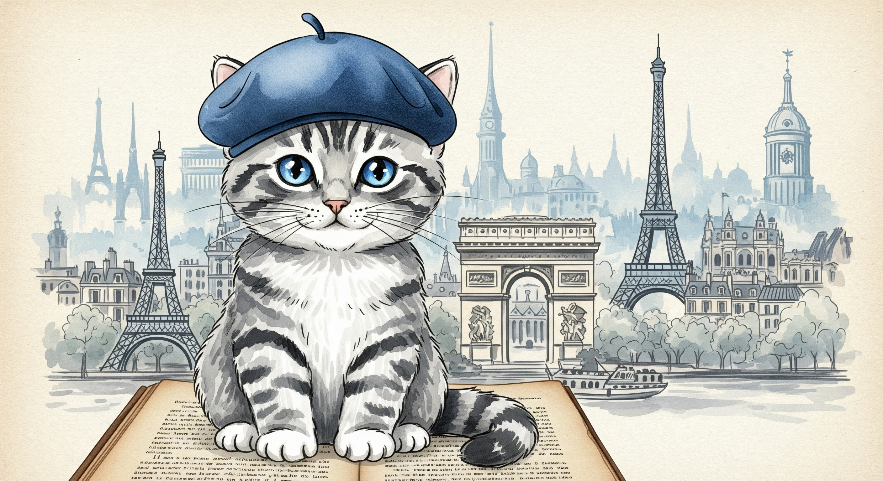 A full-body photo of an adorable cat wearing a beret, on a vintage book page background, in the style of Beatrix Potter, in a watercolor sketch style, with clear edges, in white and gray, with blue eyes, black stripes, and a blue nose. The cat has a little bit of blue in its eye and a beautiful, big, expressive, and sweet face. The background features the city of Paris, in a clipart, vector illustration, detailed design, and watercolor style.