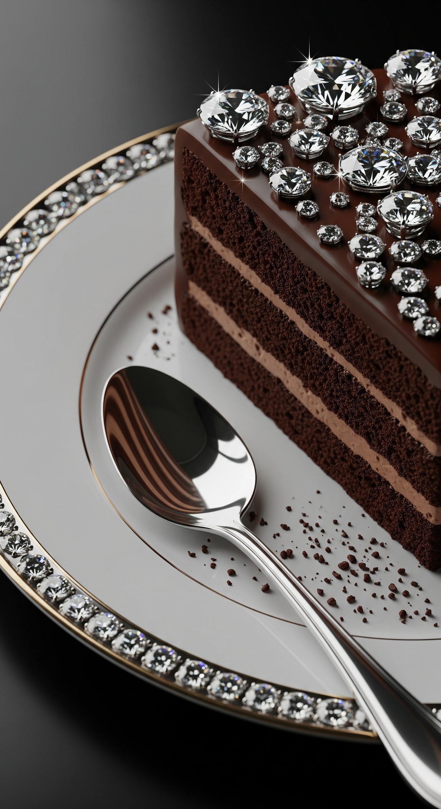 A full slice of chocolate cake, shown entirely in frame, placed on an elegant porcelain plate. Instead of powdered sugar, the rim of the plate is decorated with tiny sparkling diamonds that glisten delicately. The cake's frosting is made of dazzling gemstones and diamonds that shine like a starry night sky. Resting on the plate is an elegant polished metal spoon that completes the context. Fine crumbs and glossy chocolate textures rendered in hyper realism. Hyper realistic, ultra detailed, cinematic photographic lighting, perfect depth of field, looks like a movie frame.