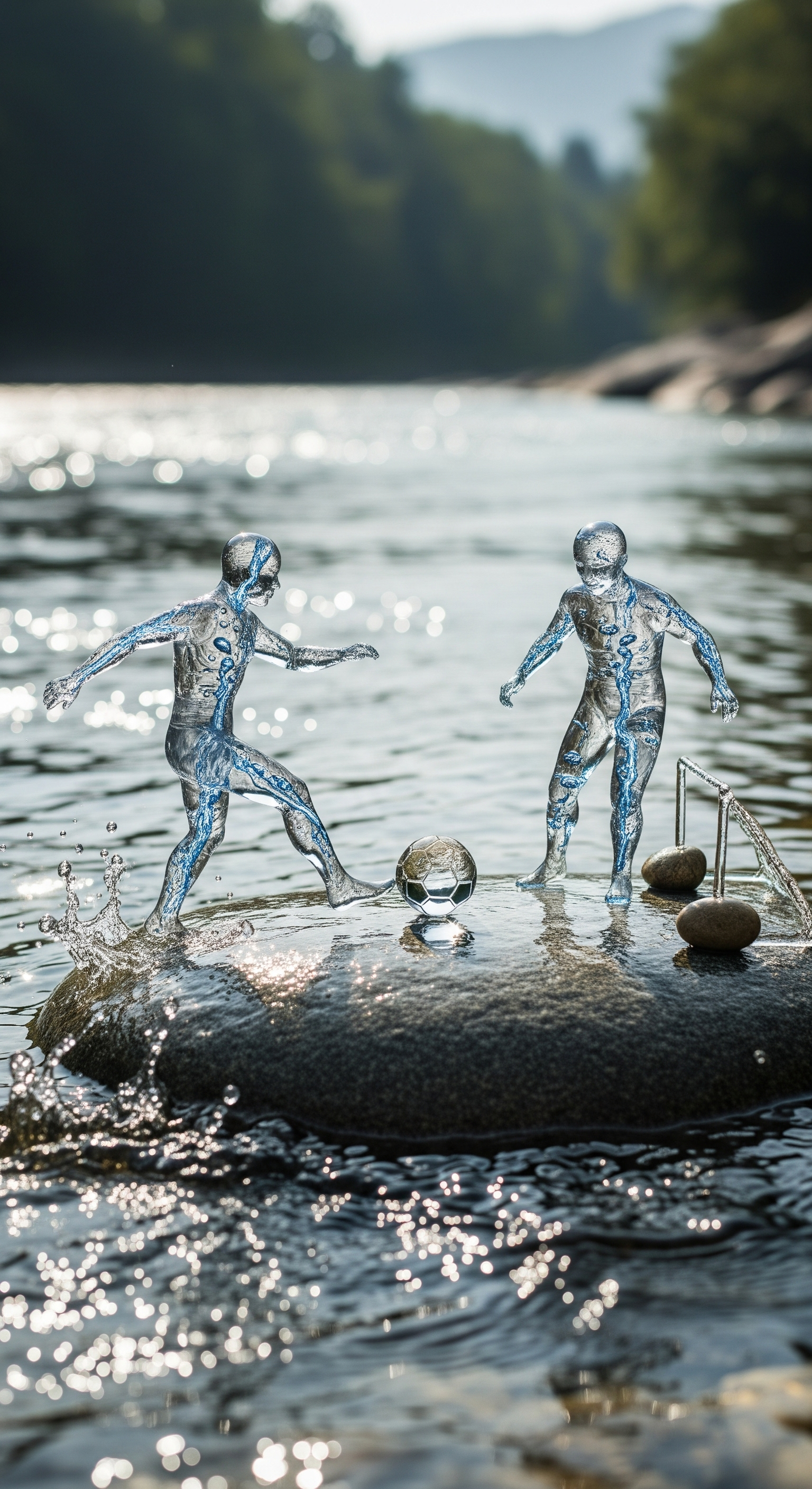 Two small humanoid figures made entirely of water, with liquid-like translucent bodies, playing soccer on top of a smooth rock in the middle of a flowing river. The river sparkles under soft natural light, with ripples and splashes around the rock. The scene is dynamic, whimsical, and surreal capturing both the playful energy of the game and the fluid nature of the water beings.