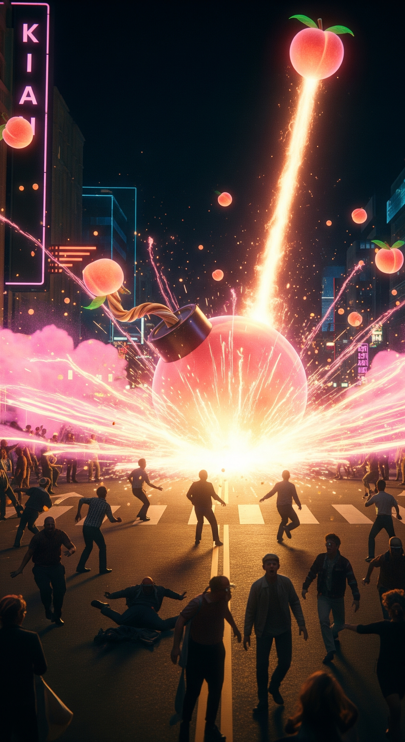 A crowded city street. Suddenly, a gigantic glowing peach bomb falls from the sky and crashes onto the ground with a dramatic impact. From the explosion, radiant peach-colored energy bursts outward in every direction, glowing pink and golden like magical waves. The energy spreads playfully across the street, scattering sparkles shaped like round fruity light. People scream and run away in exaggerated, comical ways some tripping, some flailing their arms, like a cheesy retro B-movie scene. The camera shakes with the impact, then tracks the peach energy as it shoots upward into the sky, absurd and surreal. Live-action cinematic style, vibrant neon glow, retro sci-fi parody vibe, funny and chaotic atmosphere.
