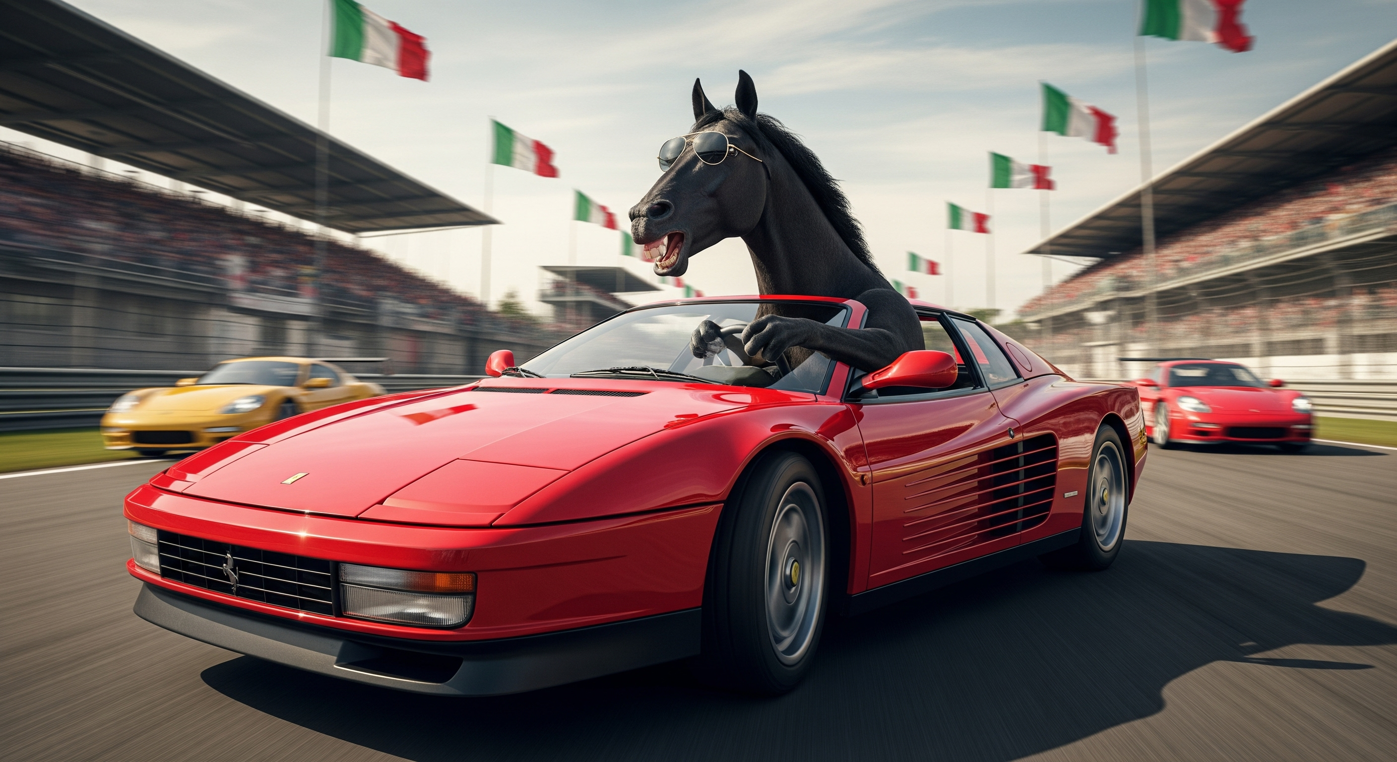 Ultra-realistic wide-angle action shot of a black horse with aviators , driving a red Ferrari Testarossa 1990 car at high speed on a Monza racing track . The horse is leaning forward with excitement, gripping the steering wheel tightly with a wide open-mouthed grin. Background features Monza crowd and italiana flags , with other racers blurred in motion. Captured with cinematic lighting, vibrant colors, dynamic motion blur, extreme sharpness on subject, immersive photography aesthetic.