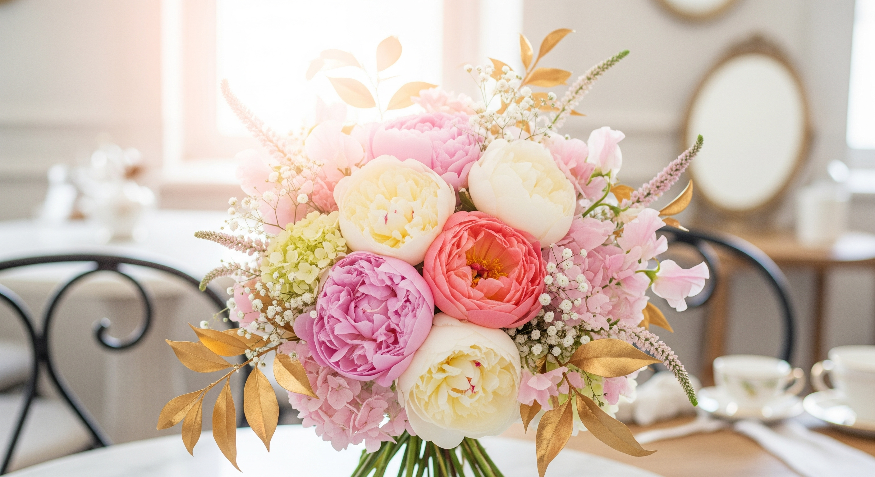 Soft glowing pastel floral buque with peonies and golden leaves, airy romantic light, luxury boutique café aesthetic
