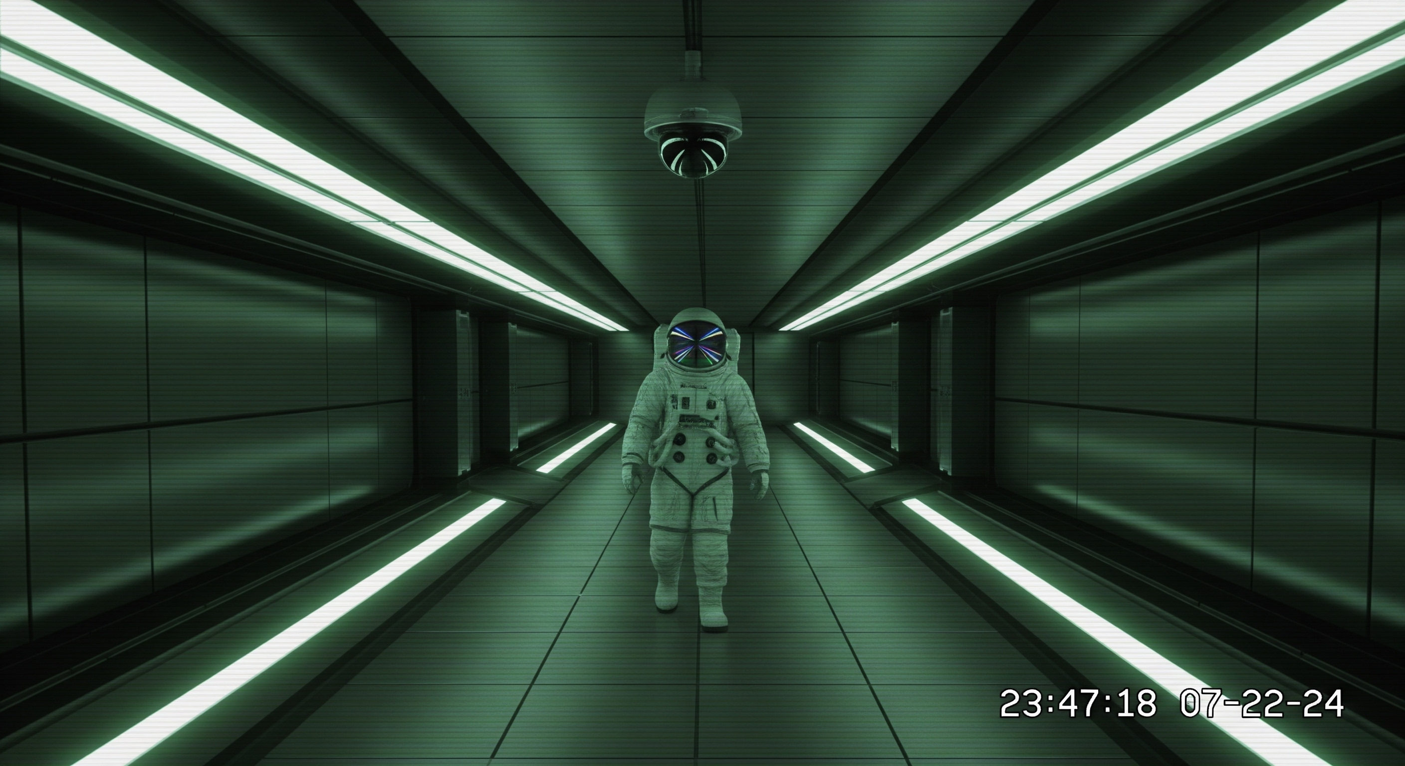 Static surveillance camera footage inside a dark corridor of a futuristic spaceship. The camera is fixed high on the ceiling, completely still, capturing the entire scene without movement. An astronaut walks slowly through the corridor, wearing a full space suit with a reflective helmet catching the cold neon lights. The atmosphere is eerie and quiet, with dim lighting and long shadows. The video has typical security camera glitches: visual static, horizontal scan lines, timestamp in the corner, and a slight greenish monochrome tone. Constant noise and interference give an old CCTV feel. The astronaut moves alone, evoking a sense of isolation and mystery.