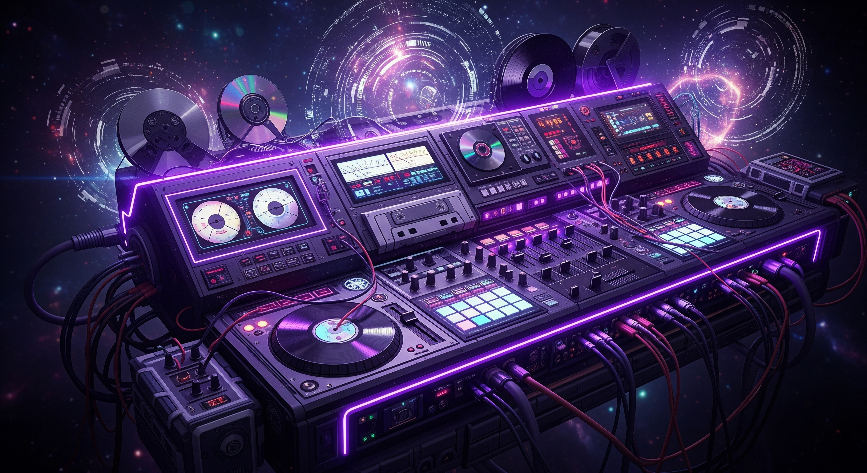 A cybernetic DJ console fused with analog retro devices (tapes, CDs, vinyls), glowing in metallic purple and neon lights, surrounded by digital fractals and cosmic energy, retrofuturistic electronic music aesthetic, dark immersive atmosphere.