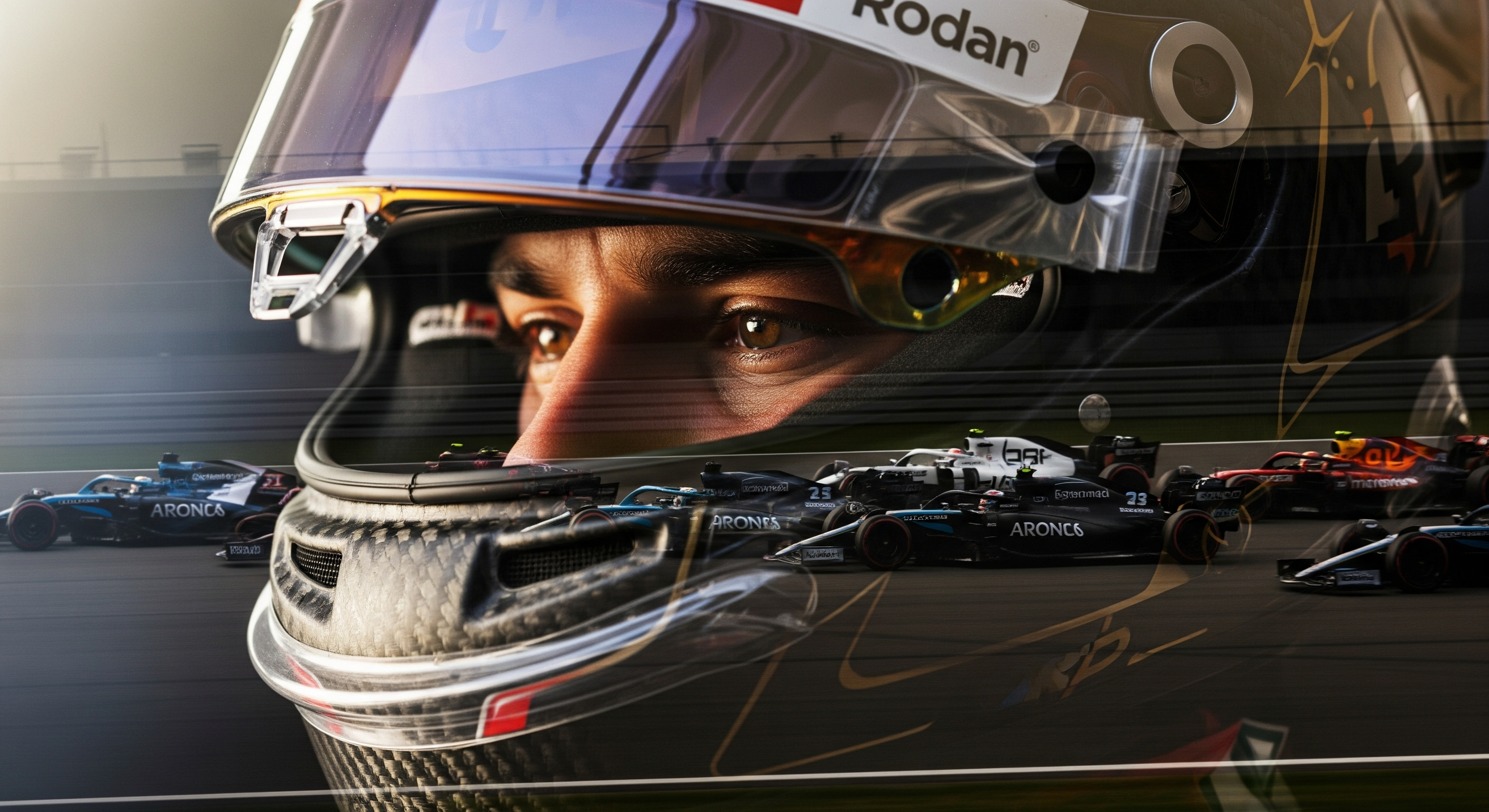 create a double exposure of a close up of a drivers racing helmet and an shot of formula 1 race cars