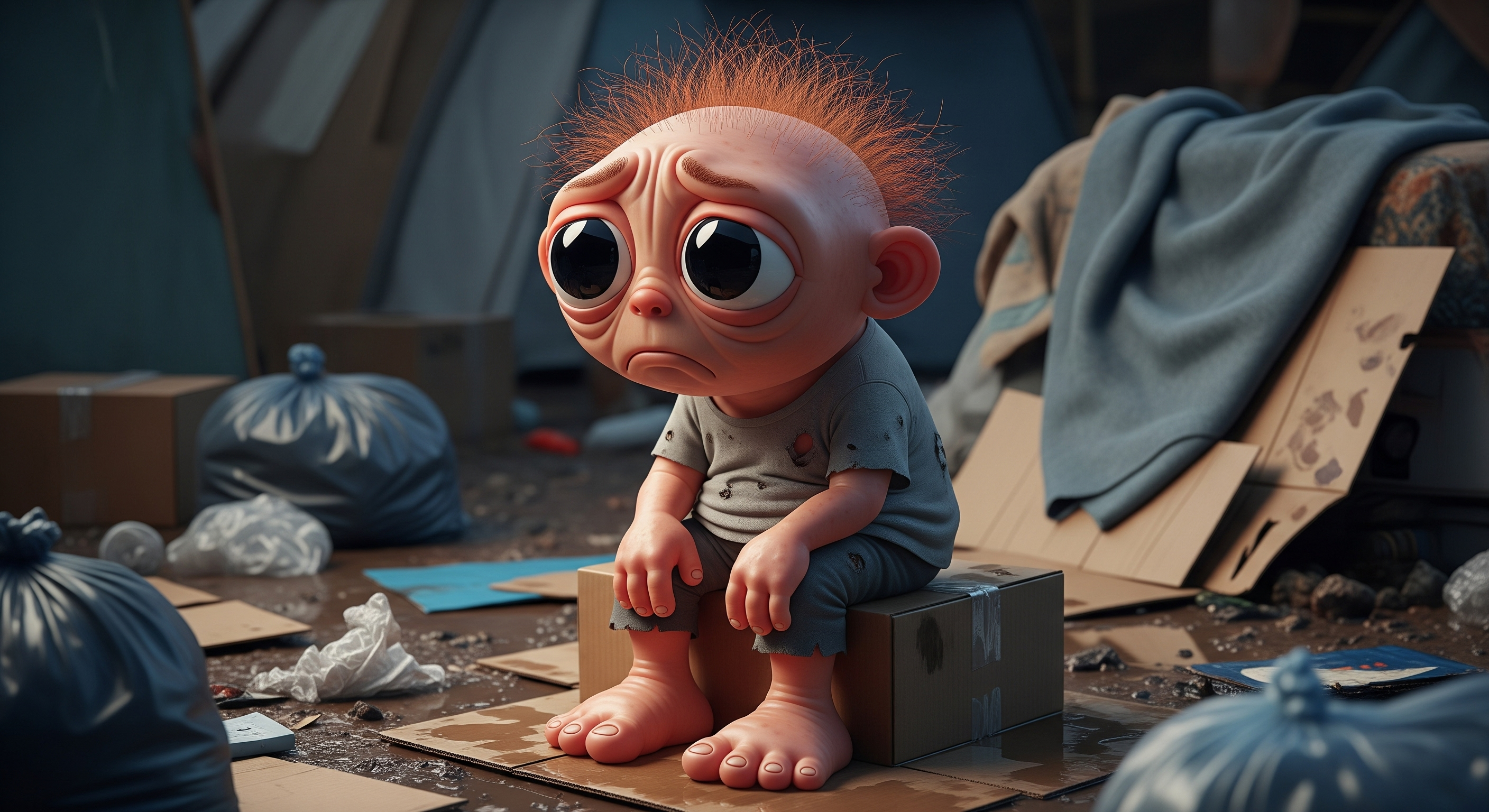 A hyper-realistic full-body photograph of a strange whimsical creature sitting sadly on a soaked cardboard box in a homeless camp. The creature has very large bulging eyes, sparse messy orange hair, smooth peach-colored skin with subtle wrinkles. Its arms and legs are short and stubby, with chubby non-human fingers and broad cartoon-like feet (not realistic human limbs). The creature wears a dirty, worn-out t-shirt. Its expression is sad, lips drooping, eyes wide and sorrowful. Around it are wet cardboard, plastic bags, an old blanket, and scattered trash. The atmosphere is melancholic but still surreal, documentary-style, ultra-detailed, 8K realism, cinematic lighting.