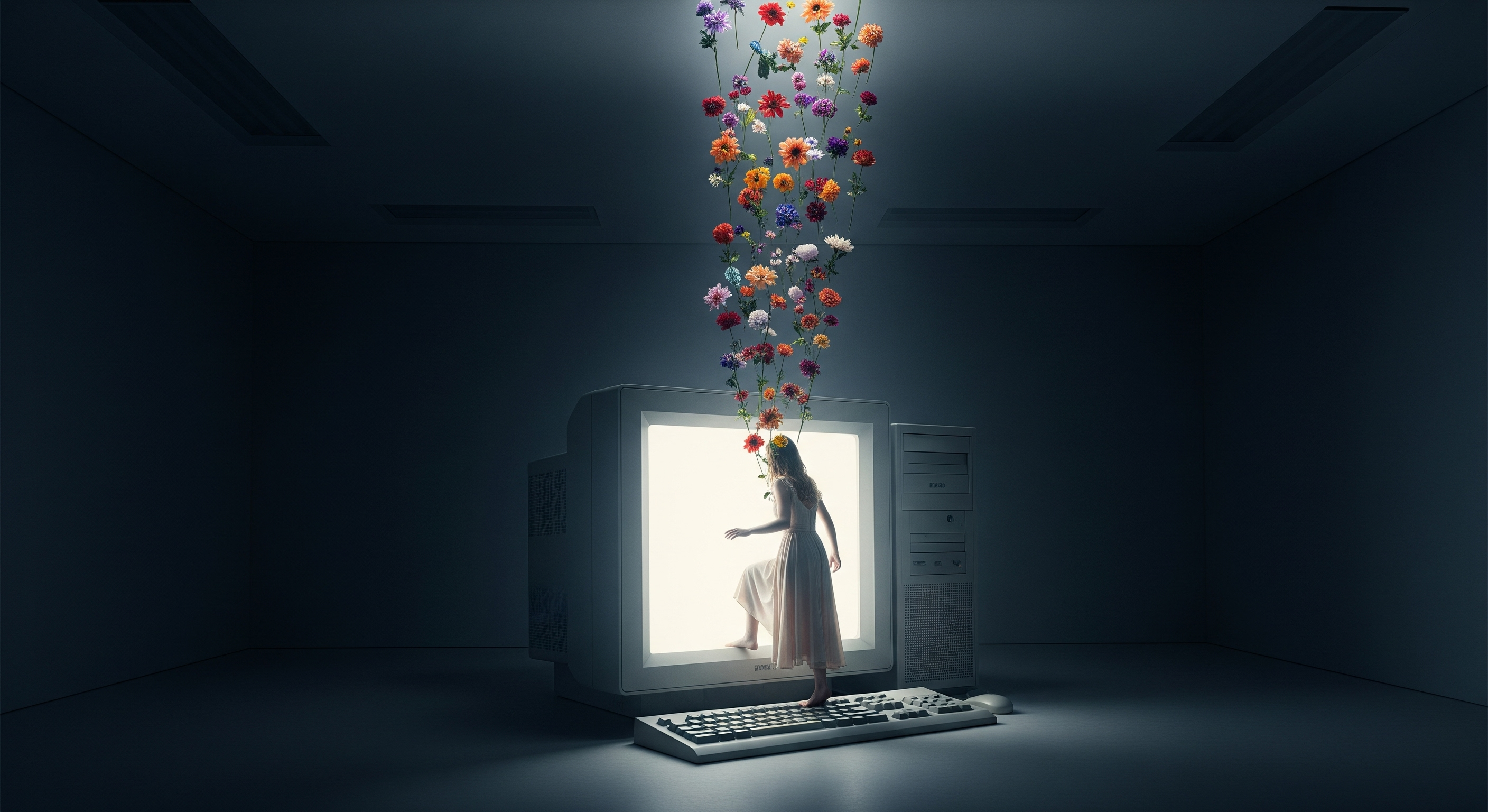dreamlike photography, distant perspective from inside the room, showing a huge old computer with a glowing CRT screen. A woman in a dress is stepping into the monitor, one foot already inside the screen, as if crossing the threshold. Flowers float upward. Room's walls and ceiling are visible. Creative atmosphere, beautiful flowers, dramatic lights, minimalistic, sigma bf shot, 50mm, 4k