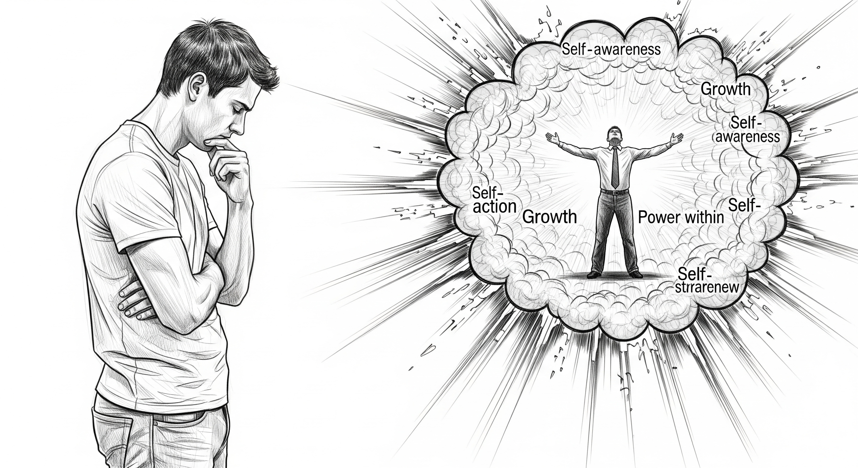 Instead of blaming circumstances, we empower ourselves by realizing that the power to change lies within us. Self-awareness and self-action lead to growth. a realistic sketch drawing of a man realizing self awareness the man and the body should move separately from the thought explosion