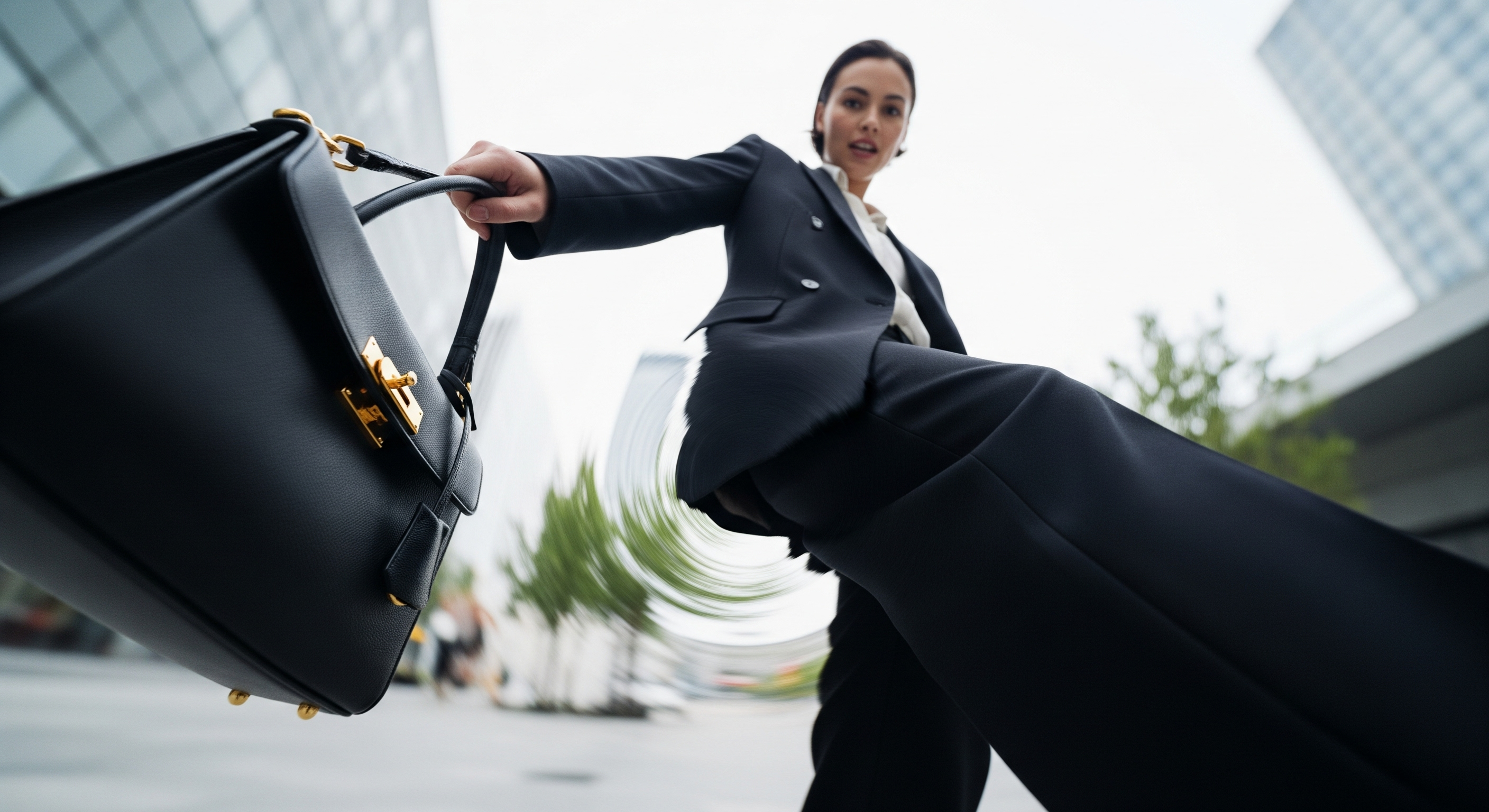 The camera sweeps upward from the handbag swinging at her side to her face, then spins around in a dramatic 360° orbit as she struts forward like a runway show.