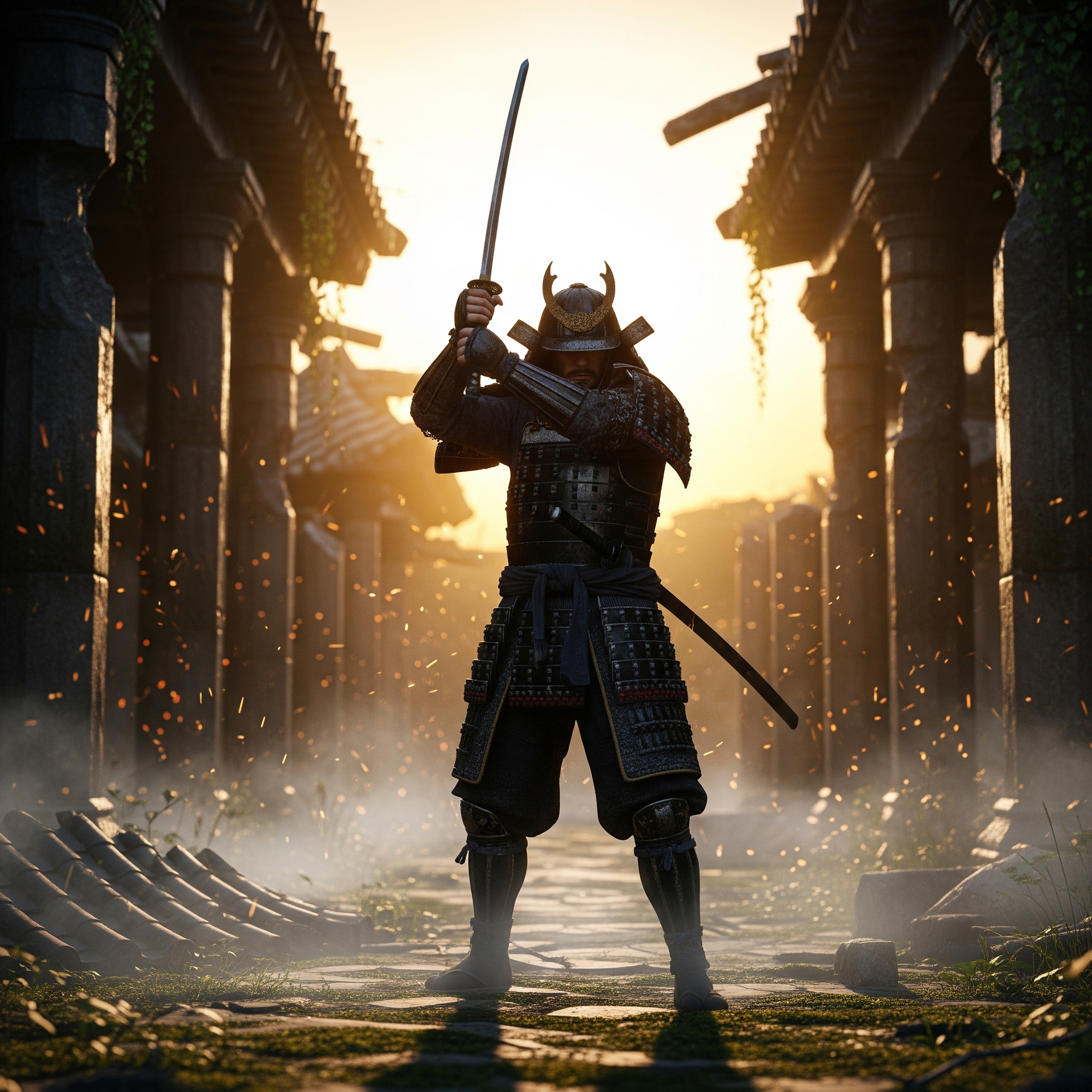 A samurai in worn black armor, standing in the middle of a ruined temple, holding his katana raised with both hands, thick mist surrounding him, sparks and dust floating in the air, dramatic backlight with golden sunset light, vertical 9:16 framing, hyper-realistic cinematic style