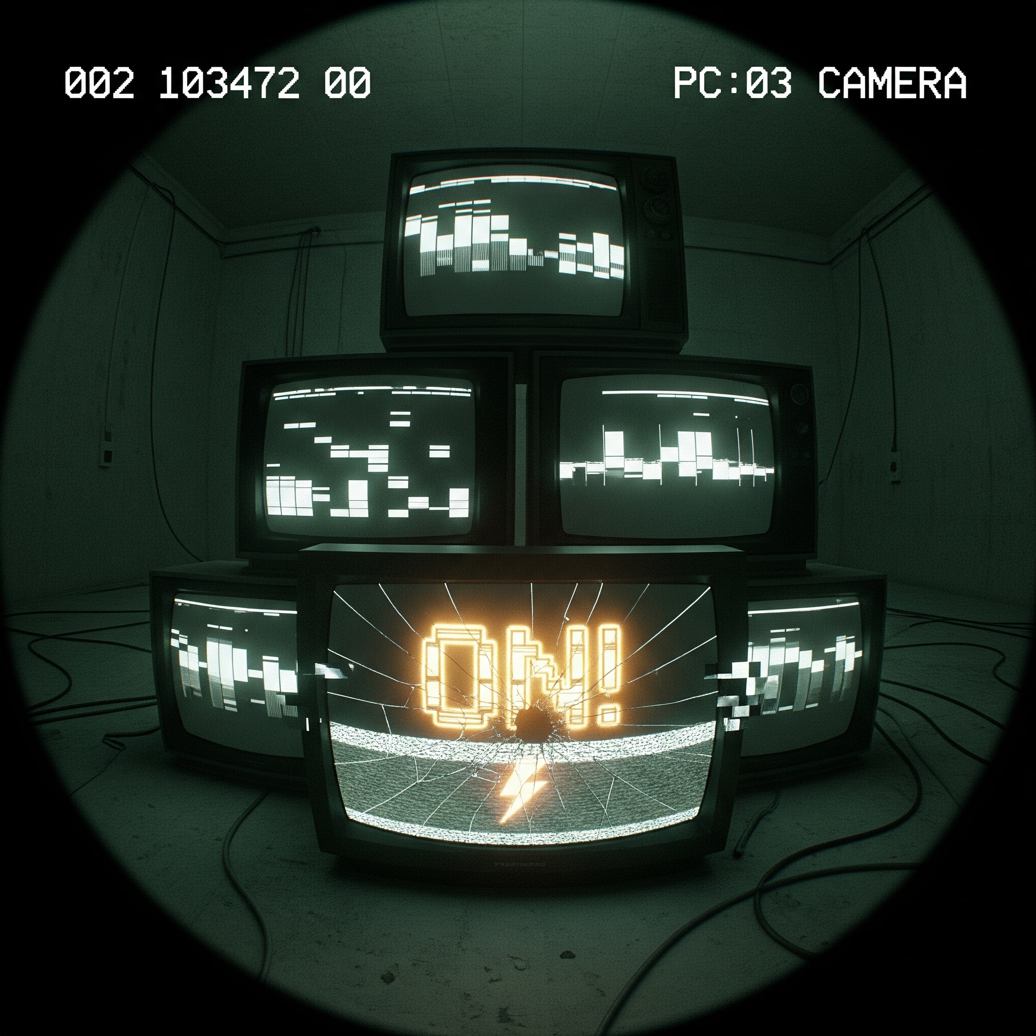 CCTV surveillance footage style, ultra-realistic, grainy low-resolution security camera look. Multiple televisions on screen, each showing sequencers that flash or shift differently. One broken television displays glowing gold text 'ON!' and a small illustration of a lightning, the screen flickers on and off, glitch effect, eerie atmosphere