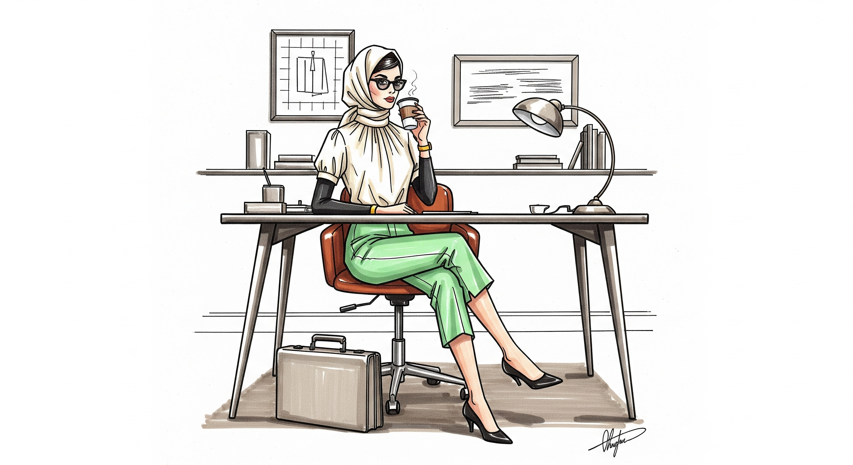 a lookbook sketch marker and pen painting image of a young woman with hijab dressed in a 1961 mary tyler moore vibe, she is dressed in a spring green pants a cream blouse, she is the office queen, she is sitting at a mid century desk, under the desk is her briefcase, she is holding a cup of coffee, the office is mid century. Styled like an ad no clutter it focuses on her. This is a fashion design for Vogue Magazine. hard angular lines fashion style drawing.
