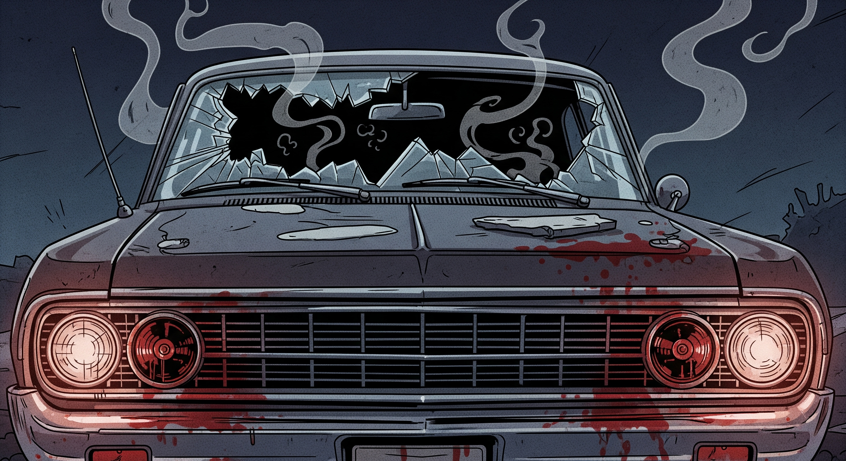 2D cartoon, close-up of a destroyed 1960s car at night, windshield shattered, faint smoke rising in eerie spirals, headlights flickering, drawn with horror comic book textures, muted colors with red accents, dramatic cinematic framing, unsettling retro vibe, without glowing eyes, not photorealistic