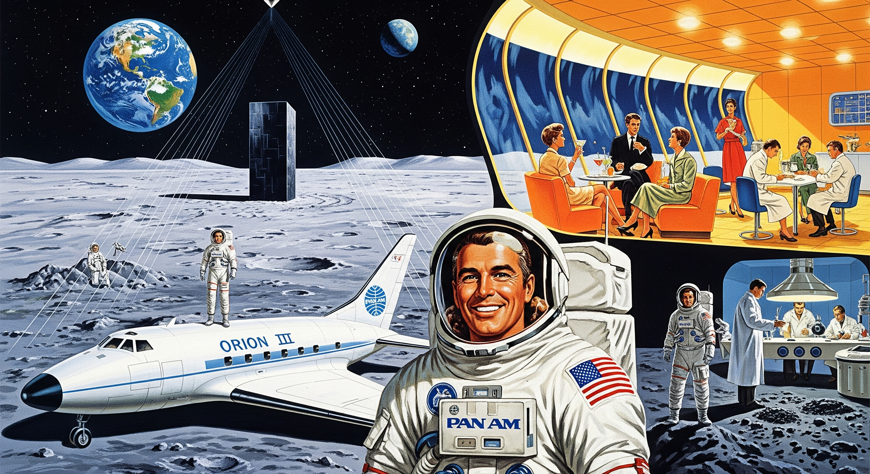vintage travel brochure 1960s illustration of a smiling Pan Am astronaut in front of an Orion III on the Moon, elegant tourists sipping cocktails in Clavius Base, close-up of the Monolith on the lunar plain, scientists studying lunar samples, astronaut admiring Earth. Orion III in the foreground, Clavius Base in the background, isolated Monolith, diagonal lines suggesting movement, vanishing point towards the Monolith, realistic textures, precise details, optimism, wonder, mystery, nostalgia, futurism, sterile lunar surface, luxurious interior, infinite space, bright artificial lighting, metallic reflections, cast shadows, bright color palette (blue, orange, yellow), touches of black and white, inspired by golden age aviation art, vintage travel posters, 1960s science fiction, Stanley Kubrick, and Arthur C. Clarke.