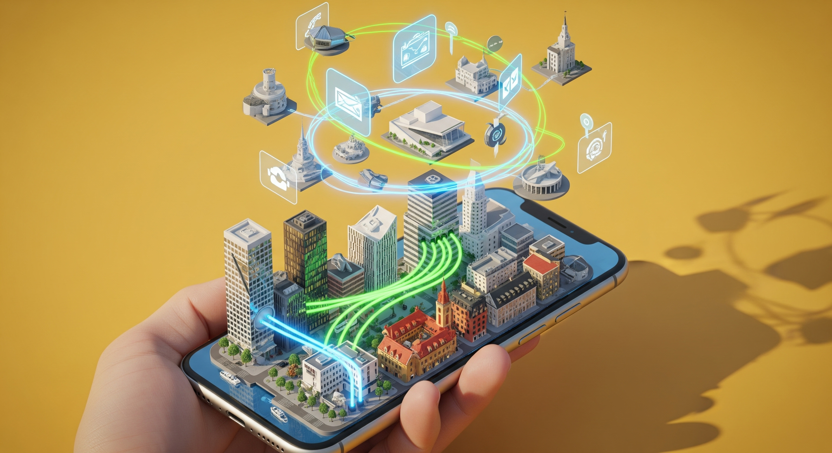 3D illustration of a futuristic city of Oslo on an iPhone in a hand, with a hologram floating above it featuring three-dimensional icons and buildings flying around. Green energy is flowing from one building to another through blue light tubes. The background is yellow, with an isometric view and a 20mm lens. The image has soft shadows, hyper-detailed cinematic quality, and vibrant colors.
