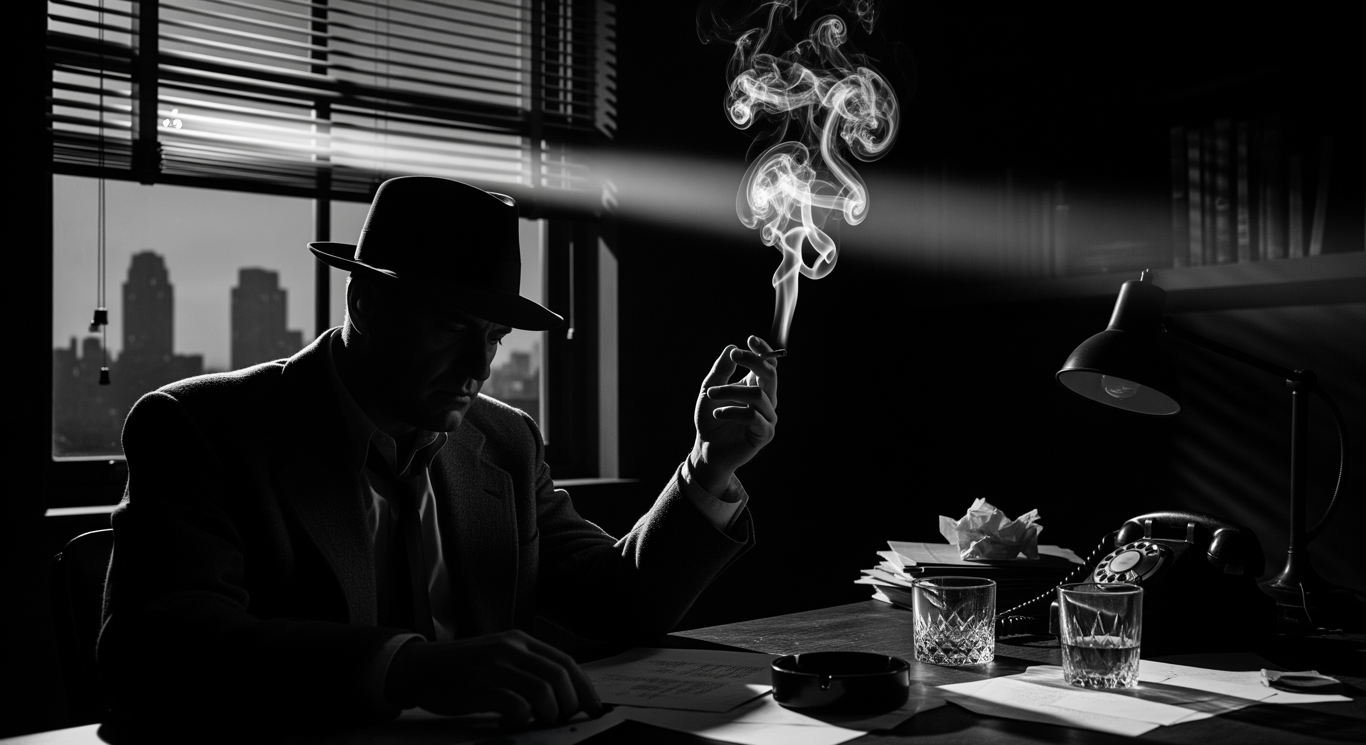 A classic, black and white, film noir scene. A world-weary private detective in a suit and loosened tie sits in his dark, messy office late at night. He is in silhouette, but a single, sharp beam of light cuts through the darkness from a window with Venetian blinds, dramatically illuminating the thick, curling plume of smoke rising from the cigarette in his hand. The smoke is the brightest element in the frame. Through the window, the faint, out-of-focus silhouette of a 1940s city skyline is visible.