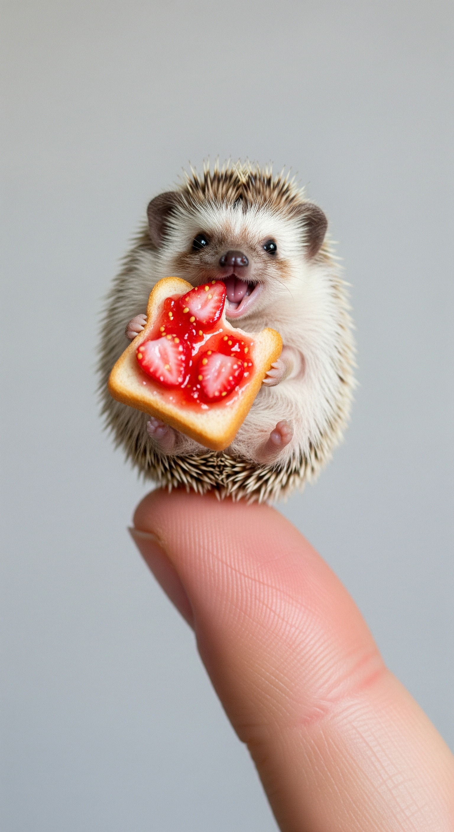 The tiniest, cutest hedgehog in the world, sitting on top of my finger,Eating strawberry toast,hapiness,Big smile at the end. Hyper-realistic photography