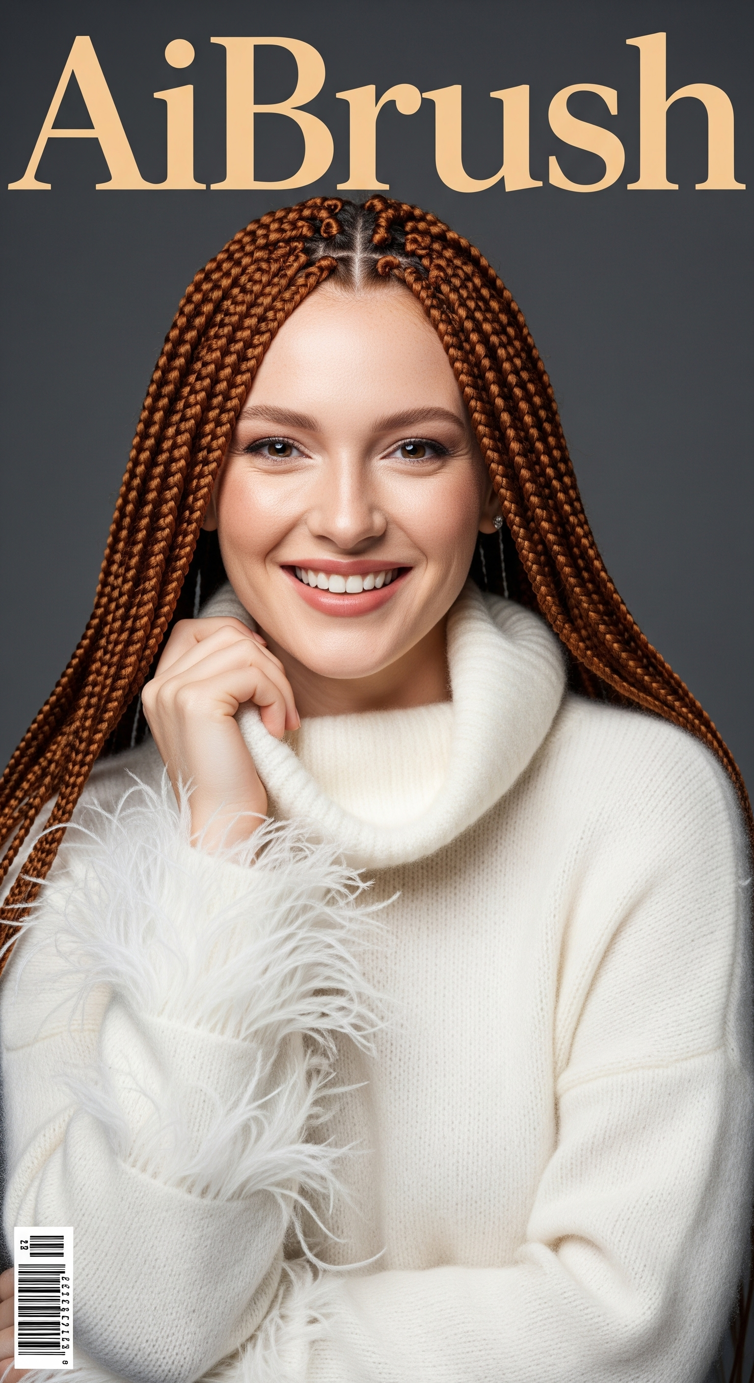 Realistic portrait of a smiling white red-headed Female model as a high-fashion model on the cover of a magazine. The girl is dressed in a soft and feathered white turtleneck sweater, she has box braids, There stands 'AiBrush' on the title.