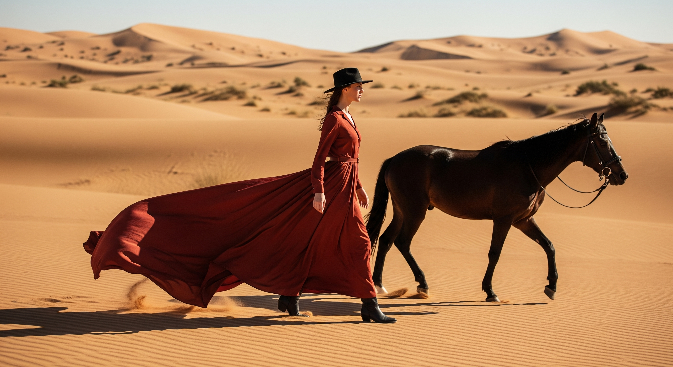Full-length model in long earthy red dress, with thin belt, black hat and boots, leading a sleek horse; dress trailing in wind; low 35-45mm, above eye-level, side sunlight or hard key 45°, shadows clean, desert as a backdrop, decisive stride