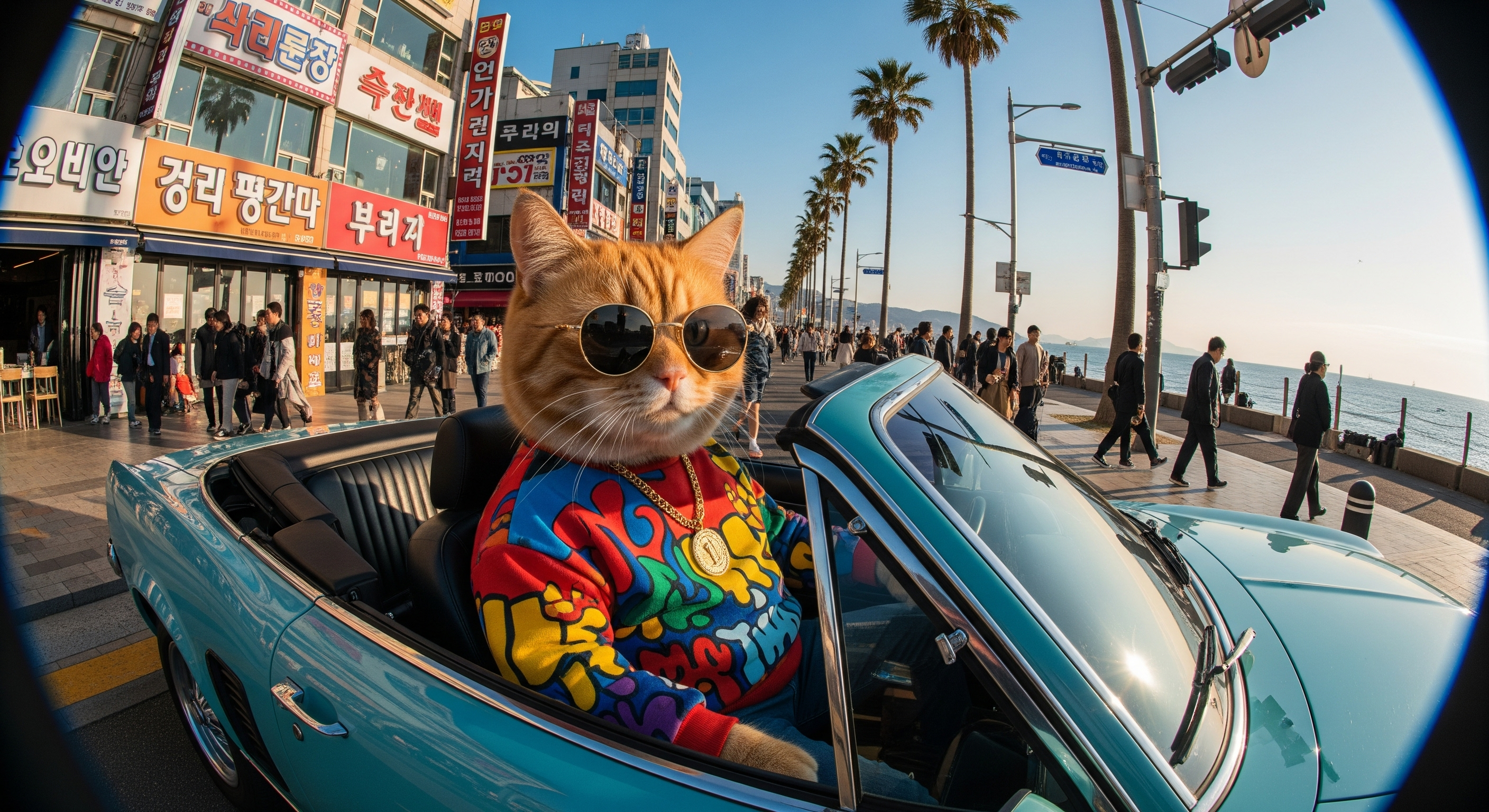 Close-up, fisheye shot. An orange cat wearing a colorful hoosweatshirt and a gold chain is driving a retro blue-green convertible through a bustling coastal street in Seoul, South Korea. On a sunny day, it's fashionable and fun.