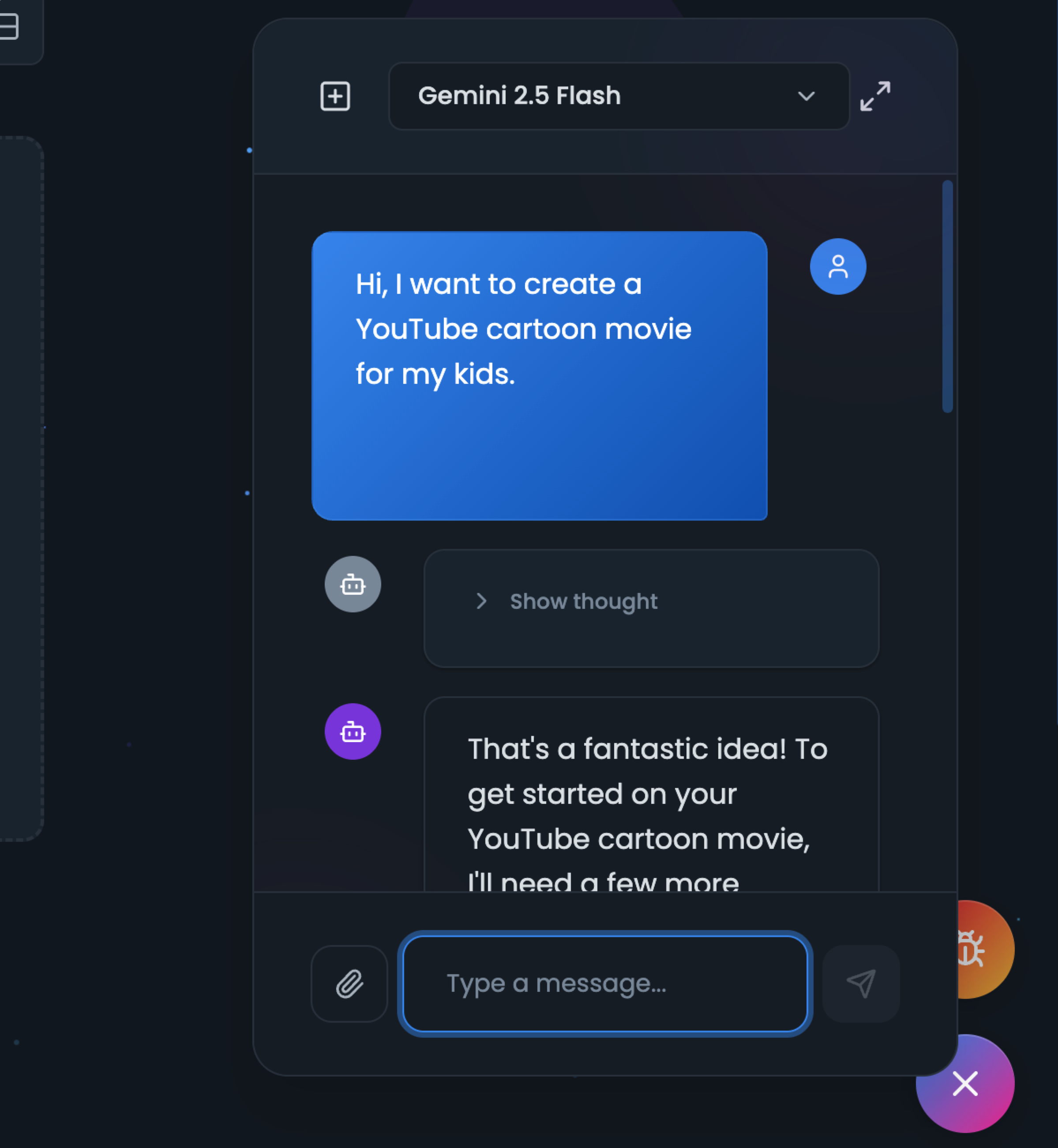 Use our AI assistant to create Videos, Images, Speech, Sound Effects, and Music through natural conversation. Simply describe what you want to create, and AI will help you bring your ideas to life across all media types.