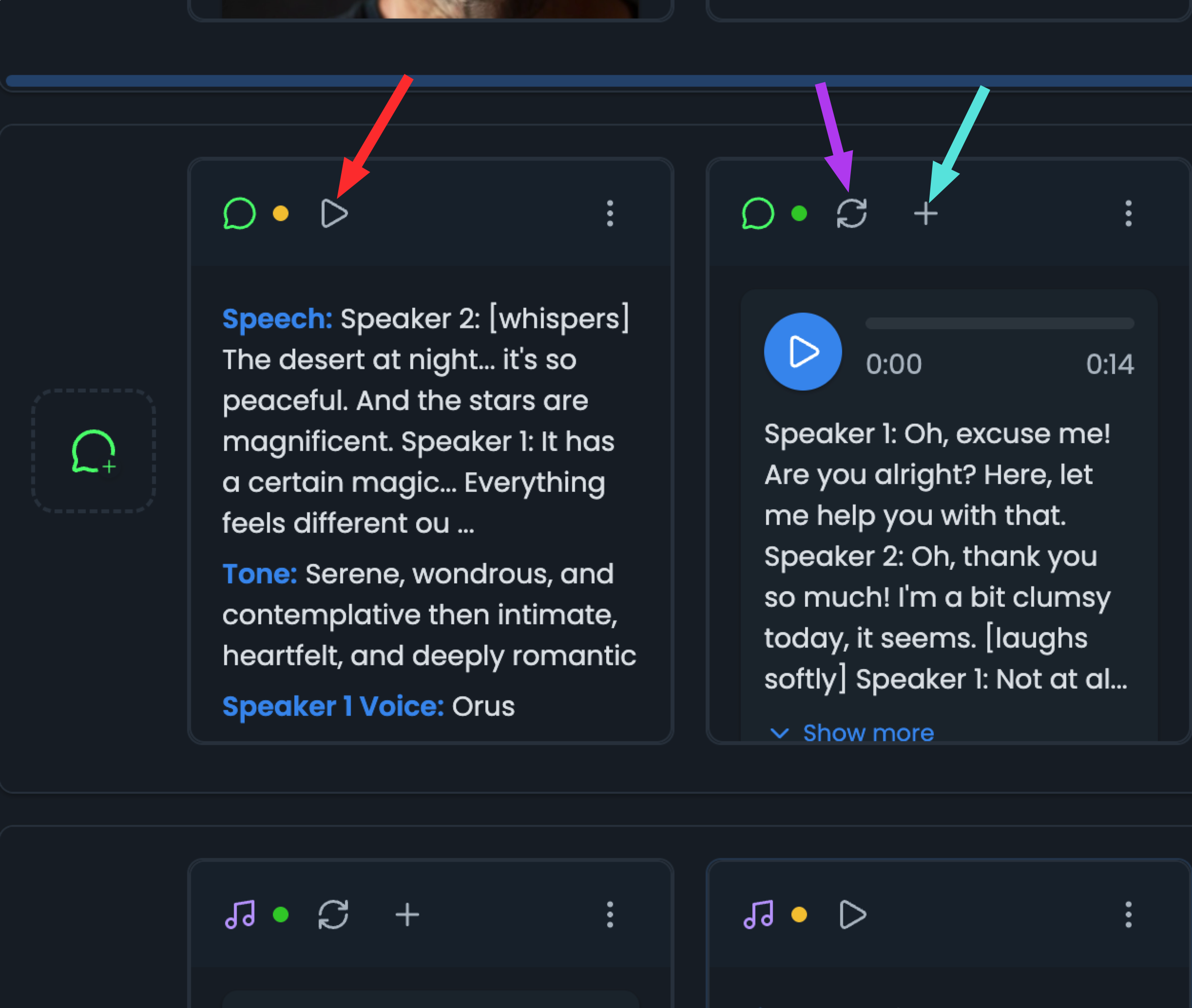 Create original music tracks and custom sound effects using our AI audio models. Once you've generated your audio, you'll see three key buttons: red arrow to start generating new media, purple arrow to regenerate if you want a different version, and blue arrow to add the item to your timeline for your project. Perfect for content creators and musicians.